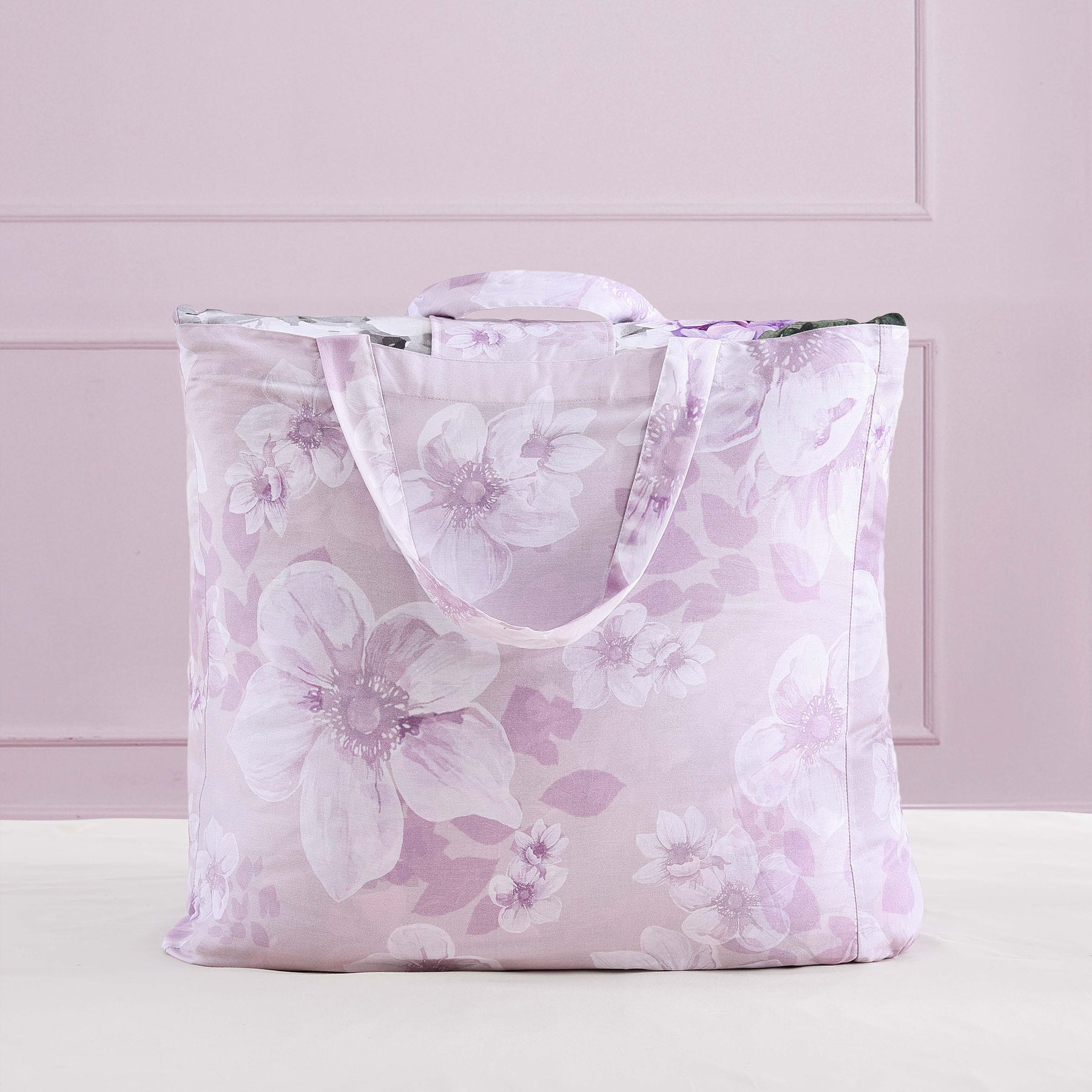 Bright bunches of hydrangeas in soft lilac and dusty rose hues are scattered across a deep grape purple background on the front of the Bebejan Purple Bliss 5 Piece Reversible Comforter Set. Versatile and coordinating, the reverse brings out the muted tones of the lilac and rose colored flowers in a lovely, allover floral print. The dusty rose color appears again in a pleasing floral printed oblong pillow, while we see the lilac in a square pillow with embroidered hydrangeas. This 100% cotton sateen 5 piece set includes 2 shams, an 18" x 18" embroidered pillow, and a 22" x 12" printed pillow. As a bonus, the set is packaged in a reusable self-fabric tote.
