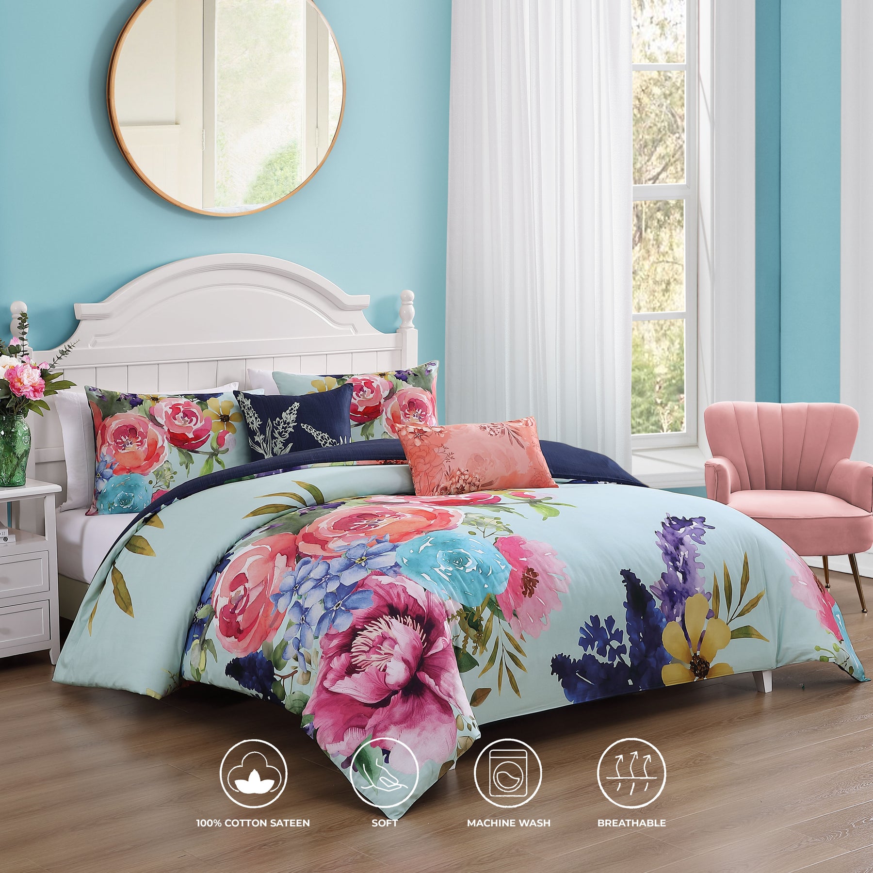 Fit for a garden party, a lovely assortment of colorful flowers in pinks, purples and indigo blue sit atop a textured aqua background for the Bebejan Aqua Fiesta 5 Piece Reversible Comforter Set. On the reverse, the printed navy blue texture complements the front print perfectly, and can be used as a second look for your bedroom. The comfy 100% cotton sateen comforter set also includes 2 zipper shams, a tonal floral printed 22" x 12" oblong pillow in shades of rose, and an 18" x 18" square pillow with outline embroidered hyacinth flowers.