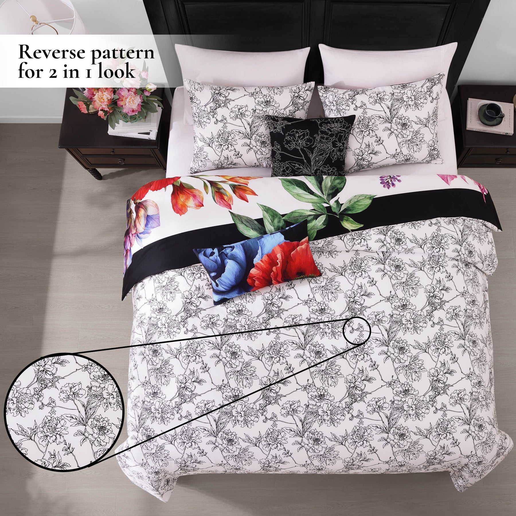 Fresh, vibrant flowers in bright multiple colors are elegantly framed in black for the Bebejan Petal Portrait 5 Piece Reversible Comforter Set. A black on white small floral print on the reverse provides the perfect partner to the front print, and also gives a second look for your room. The printed oblong pillow has a close up view of the blue and red flowers, while the square pillow has a contrast white on black embroidered sketch floral pattern to coordinate beautifully. This 100% cotton sateen 5 piece set includes 2 zipper shams, an 18x18" embroidered pillow, and a 22x12" printed pillow.