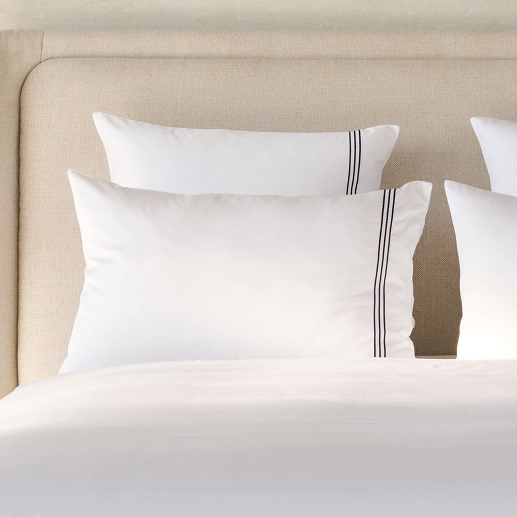 Concorde, meaning harmony in French, offers chic, timeless style of pure white embellished with modern embroidered lines in marine navy blue. Three rows of bourdon embroidered lines in marine navy blue on the pure white sateen bedding enliven the Concorde design. The hand guided marine navy blue embroidered lines run the length on one side of the duvet cover. The embroidered line detailing is expertly executed. Sateen construction, 300 TC, made of 100% long-staple combed cotton. Made in Portugal.