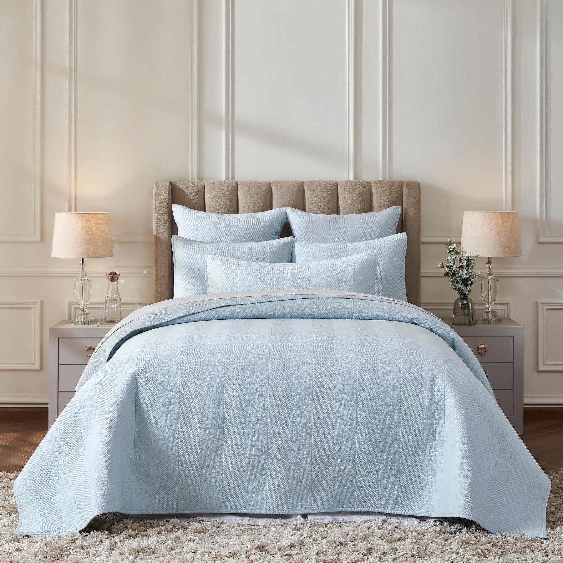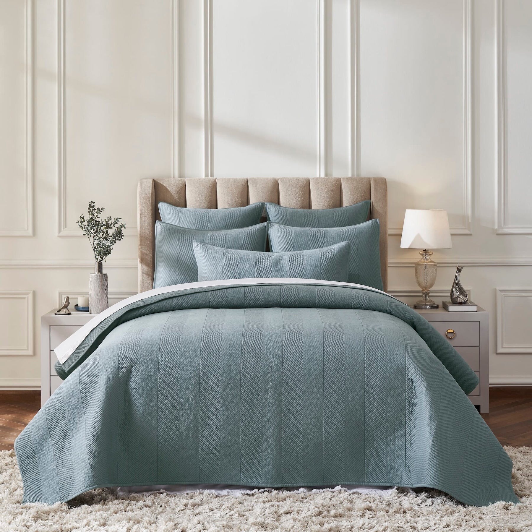 Traditional Herringbone pattern never fails to smarten things up, especially if you like the pristine style of a luxury hotel. Made from 100% Cotton and quilted using the traditional machine technique, Athena has a wonderfully subtle texture in the style of delicate zig zags. Add a rich, supple texture to the bed with our Coverlet's intricately quilted herringbone pattern. A special garment-washing technique makes the Cotton Sateen bedding even softer.