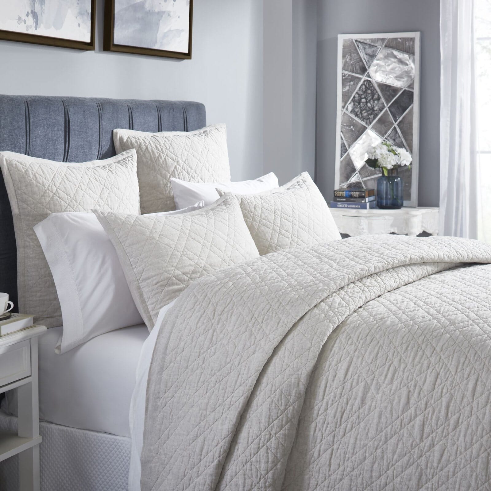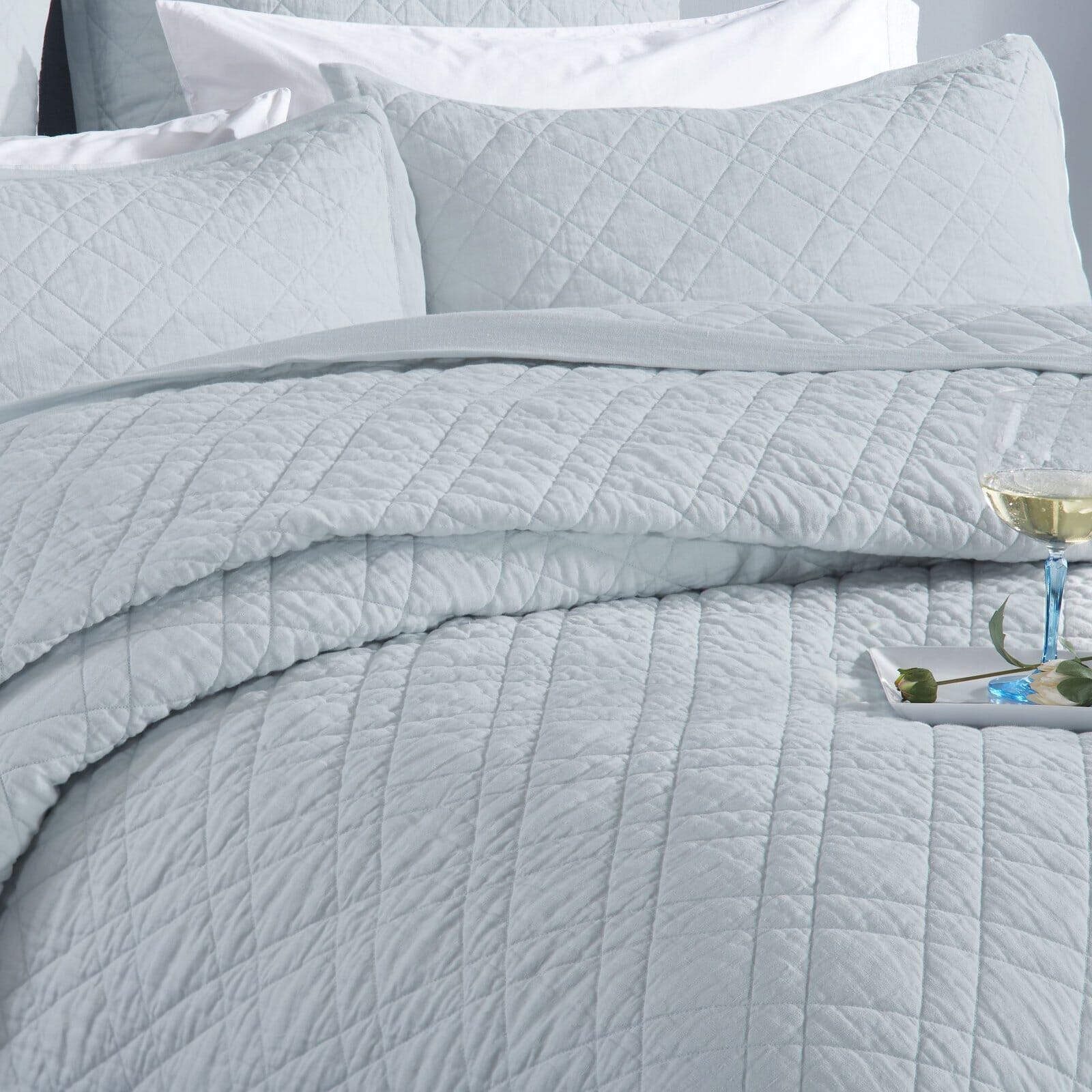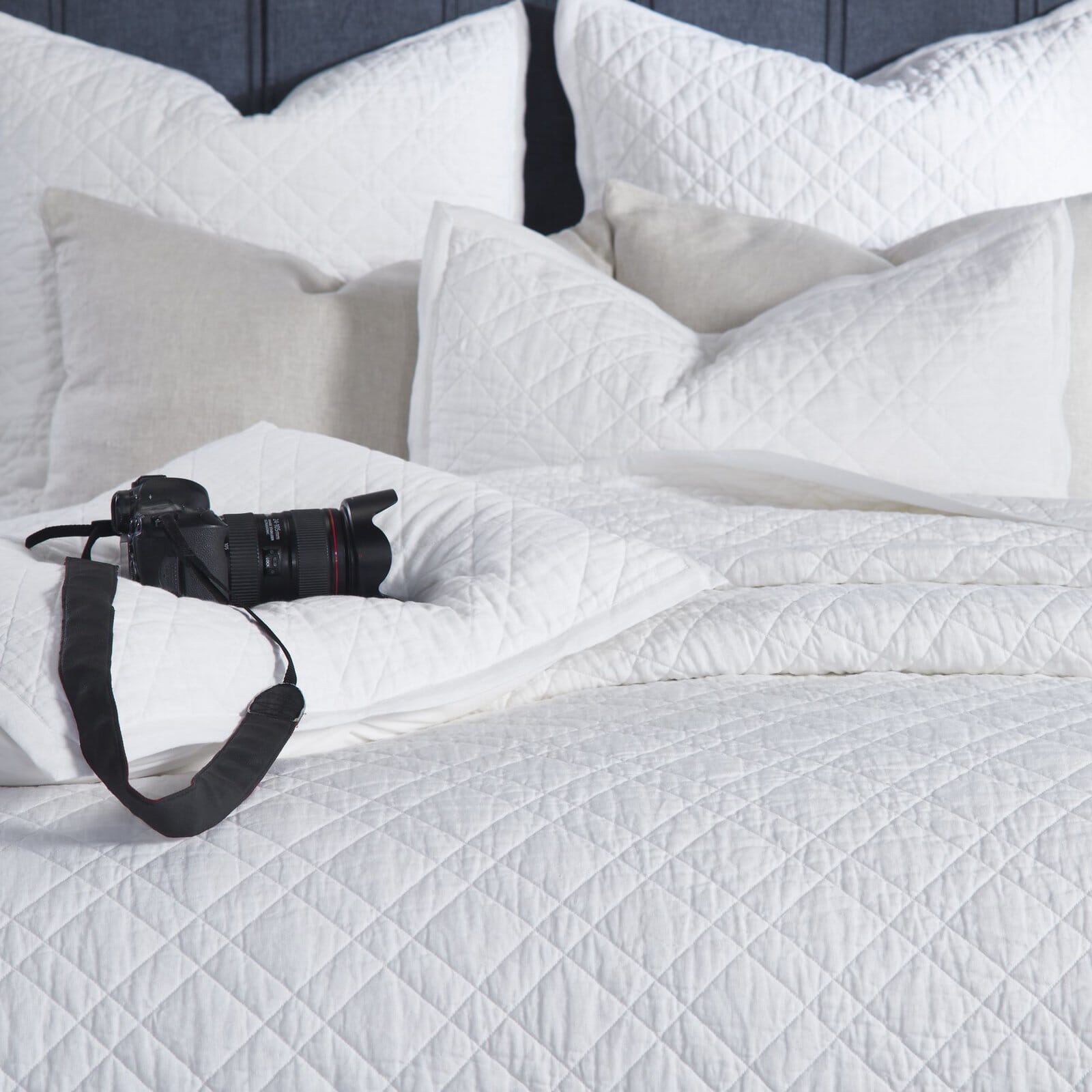 Our Chloe coverlet and shams are made from 100% European Linen in the front and backed by 100% cotton voile. They feature quilting and padding in a geometric pattern adding comfort and coziness to your bed and are designed in a simple elegant way. It's a perfect combination of form and functionality created for the mind body and soul.