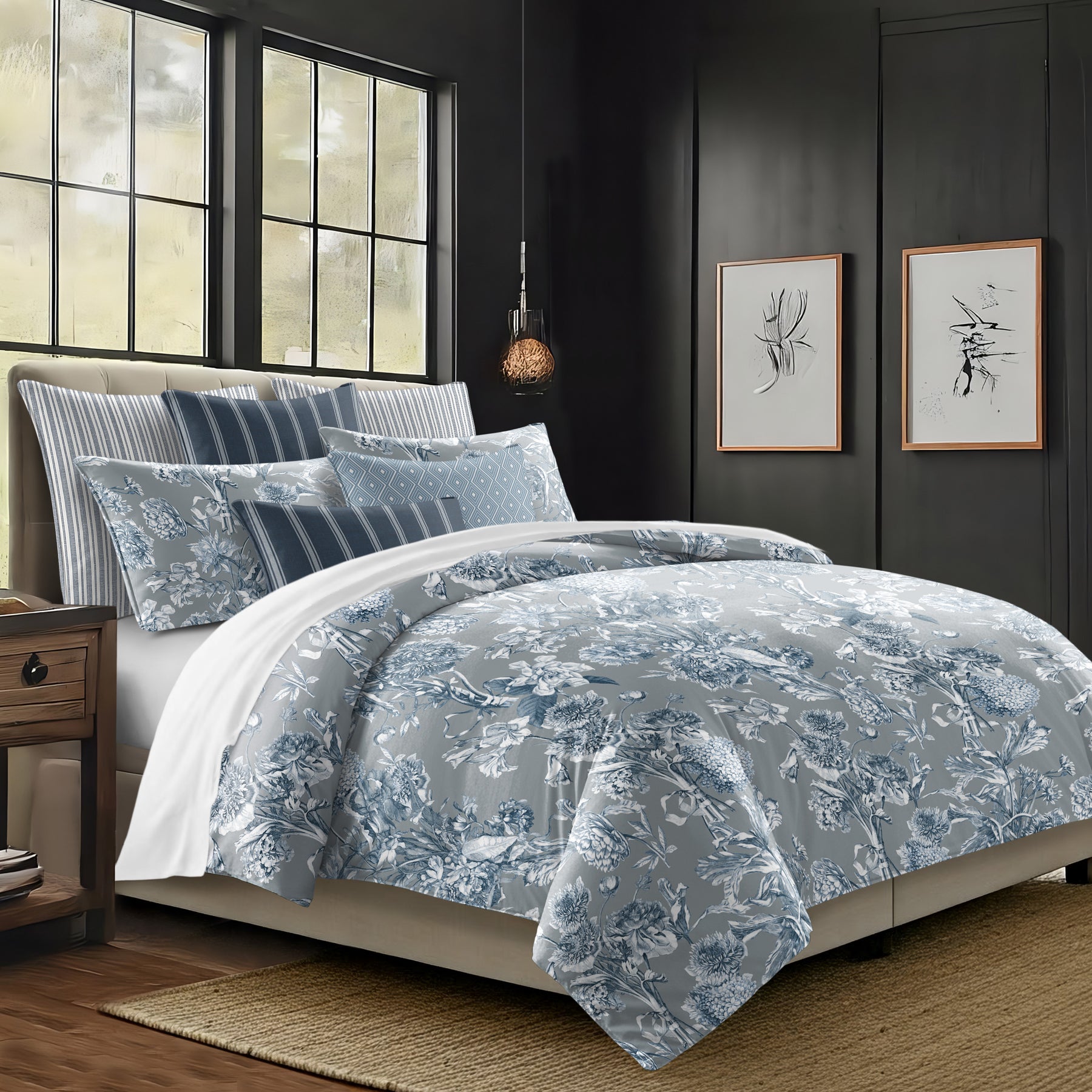 Complete Designer Set Includes: 1 Duvet Cover, 2 Pillow Shams, 2 Euro Shams, 3 Decorative Pillows