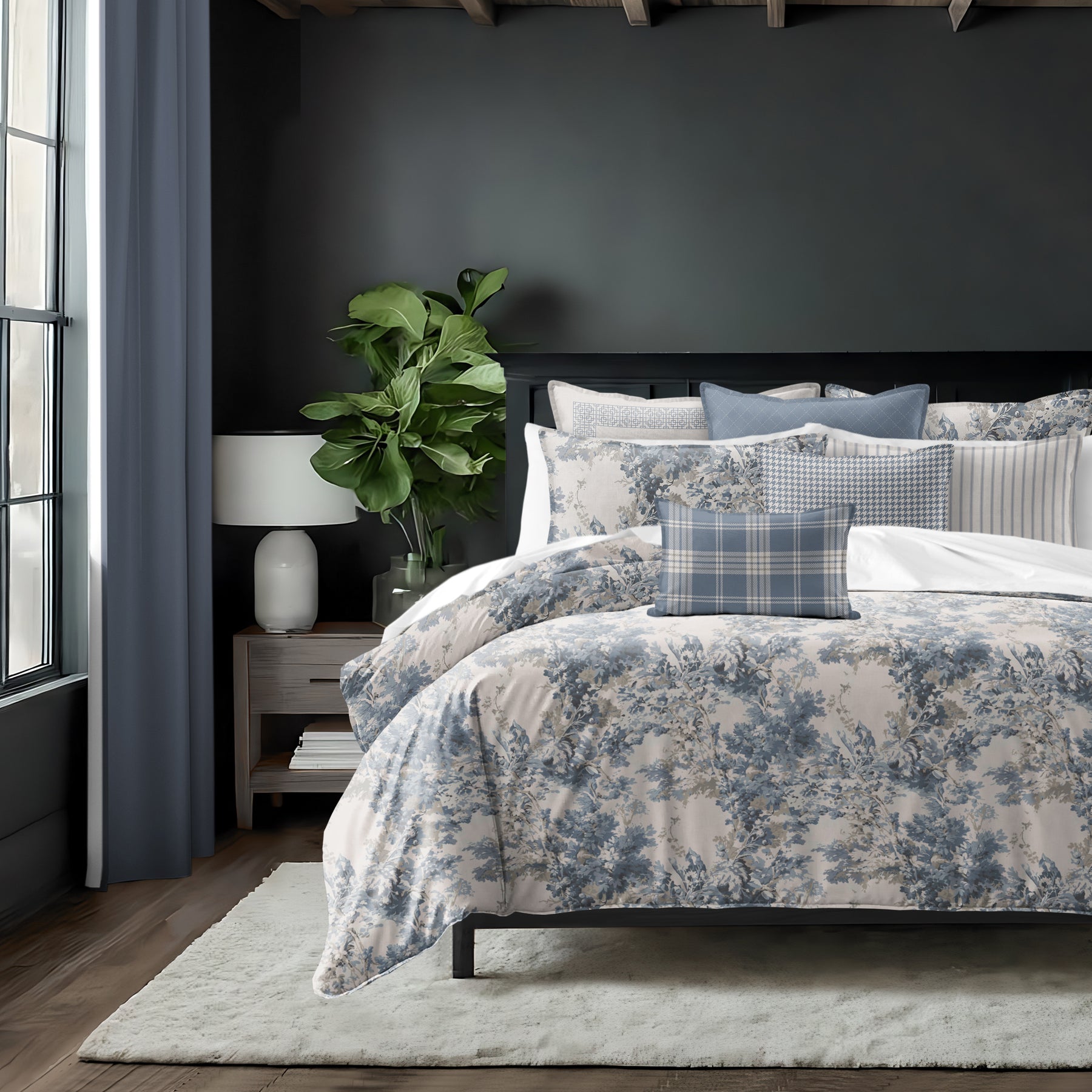 Complete Designer Set Includes: 1 Comforter, 2 Pillow Shams, 2 Euro Shams, 3 Decorative Pillows