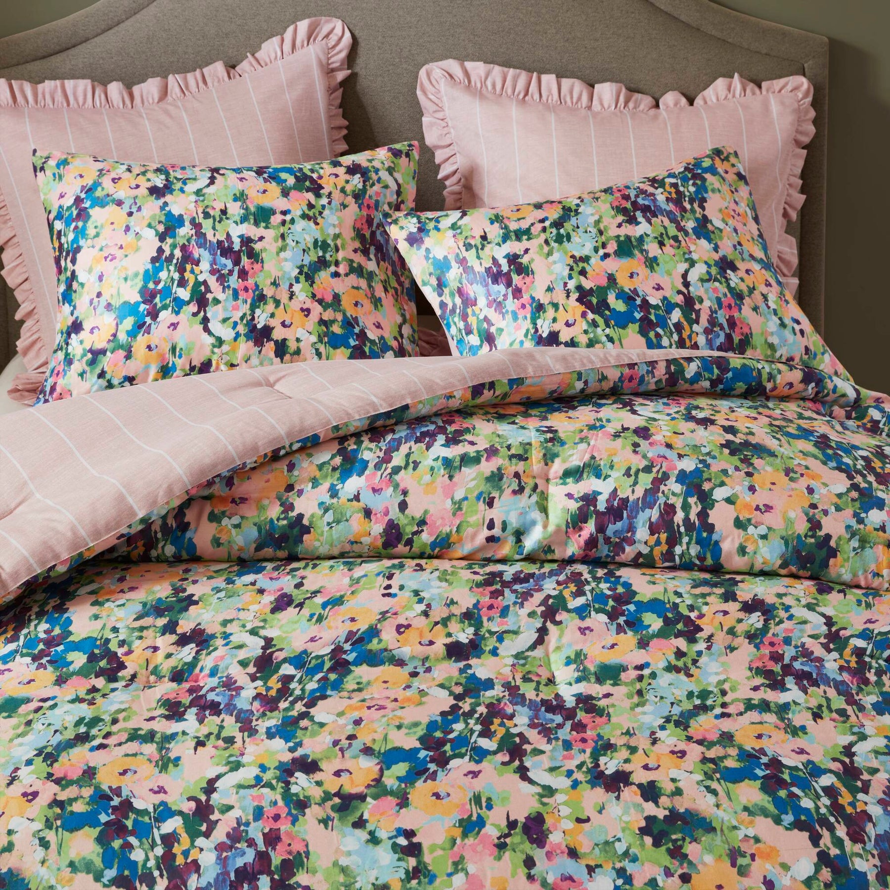 Transform your bedroom into a charming cottage retreat with this modern abstract floral comforter set, featuring a vibrant multi-color design that brings a fresh, farmhouse-inspired touch. The high-quality digital print enhances the vivid color palette, while the naturally breathable cotton top offers a cool-to-the-touch feel. Soft brushed microfiber on the reverse adds warmth and coziness, complemented by plush poly filling for snug, all-season comfort. The reversible design allows you to effortlessly flip the comforter and pillow shams, with the ruffled edge on the pillow shams adding a romantic shabby chic touch. OEKO-TEX STANDARD 100 certified for peace of mind, this set ensures overall comfort and wellness, with easy care for effortless upkeep.