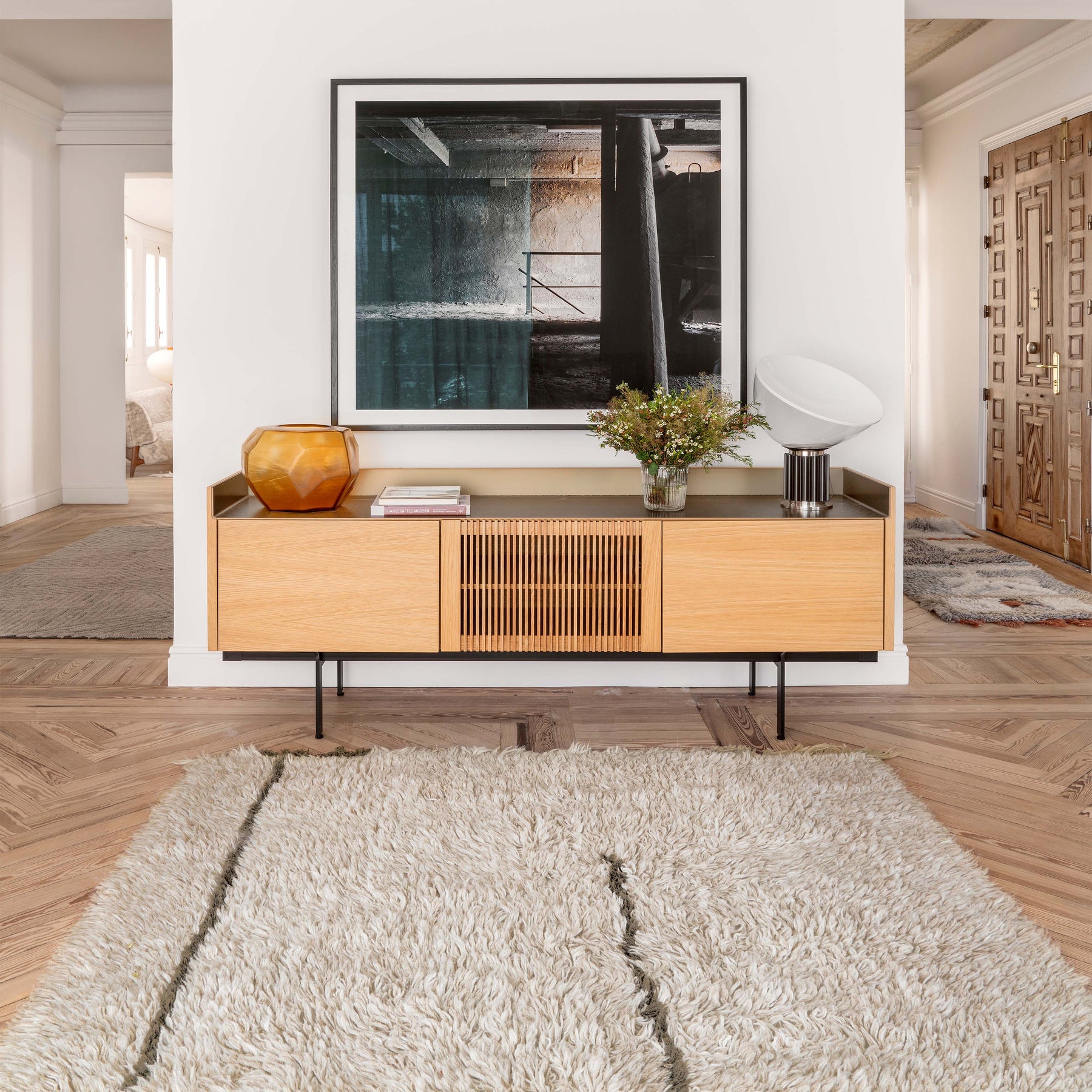 A fluffy, long pile rectangular wool rug, in Natural color mixed with Sandstone and with contrast lines in Almond Frost. Uneven fringes at edges gives the rug a bohemian, hippie look. A cotton tote bag and a non-slip underlay are included with every rug. This is a unique artisan piece, carefully designed by Lorena Canals and sustainably handcrafted in our own factory using natural fibers and upcycled materials, non-toxic dyes, and a firm commitment to the planet and people. From the design process, to material sourcing and production, we always choose options that minimize waste and ensure long-lasting designs. This product is made with RWS-certified wool. The RWS is a voluntary global standard that addresses the welfare of sheep and of the land they graze on.