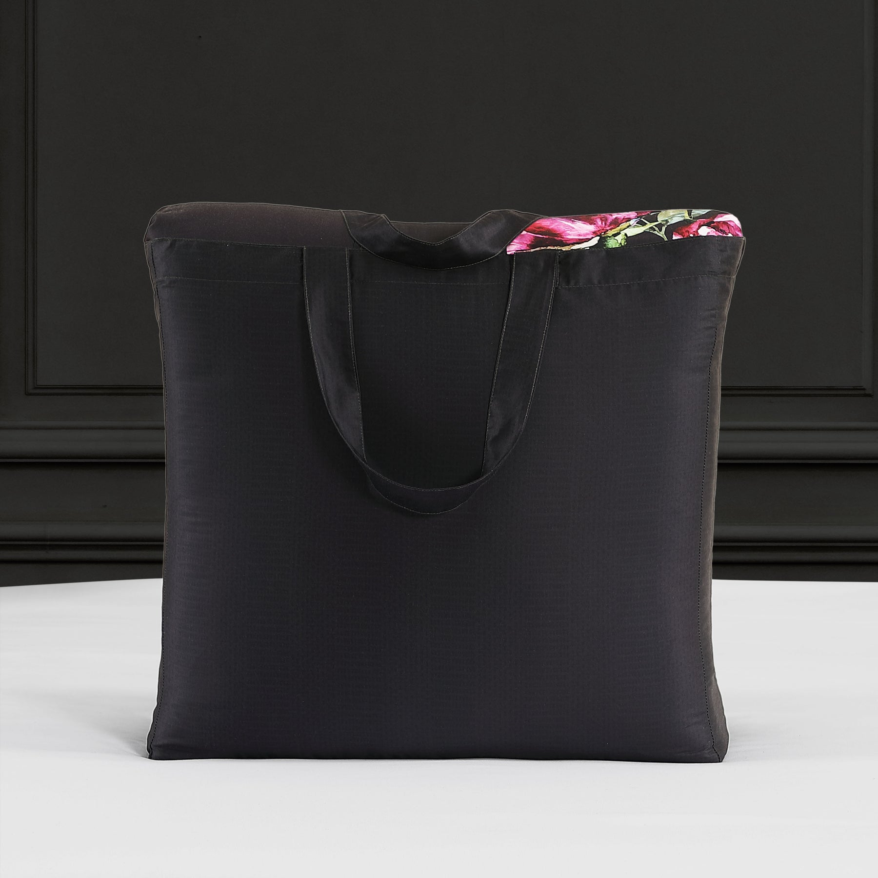 Colorful poppies, mixed with hydrangeas, camelias, hibiscus and others, are illuminated against a black background on the Bebejan Black Night Poppies 5 Piece Reversible Comforter Set. The reverse has a tonal printed texture in dark grey and black hues for a second look in your bedroom. The high quality 100% cotton sateen set includes 1 reversible comforter, 2 zipper shams and 2 decorative pillows. The 22"x12" oblong pillow has a three row framed embroidery in 3 coordinating colors, while the 18"x18" square pillow is a mosaic style print highlighting the pink flowers. As a bonus, the set is packaged in a reusable self-fabric tote.