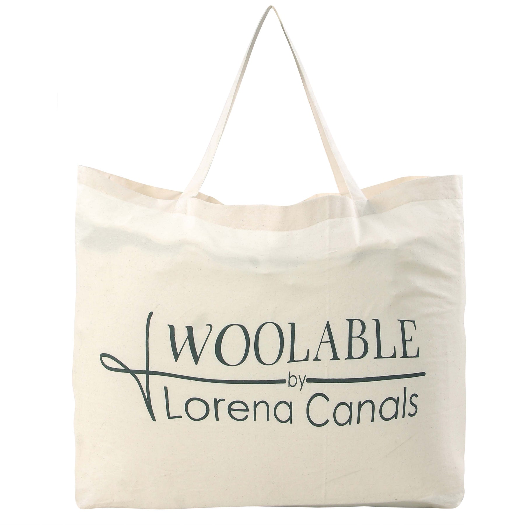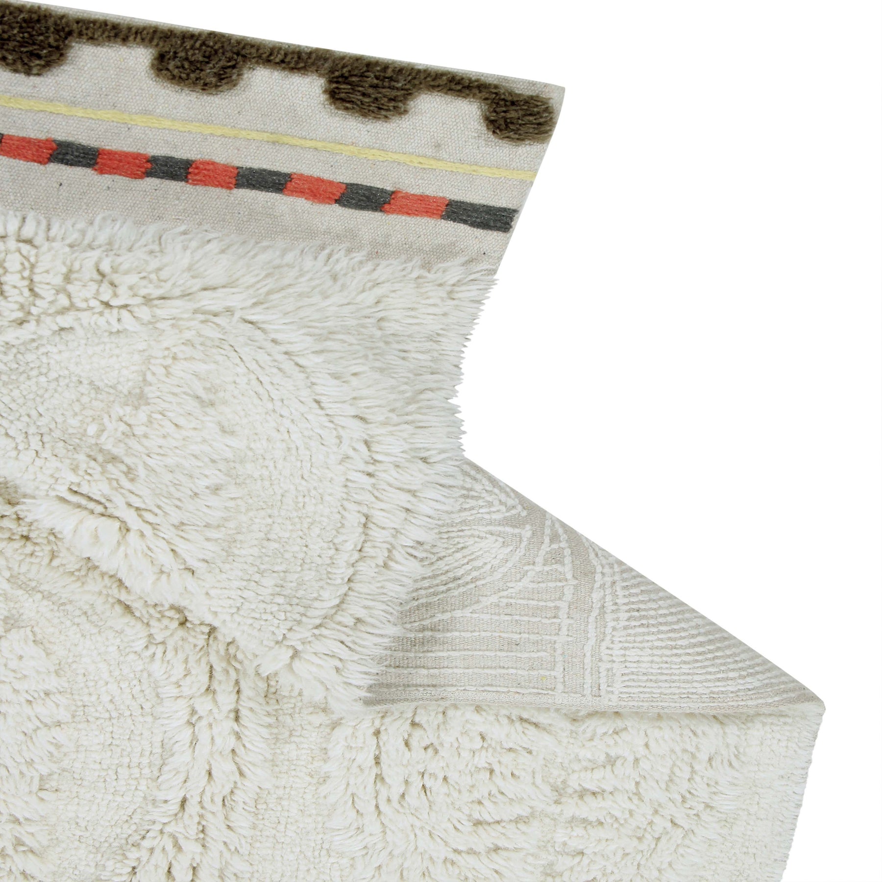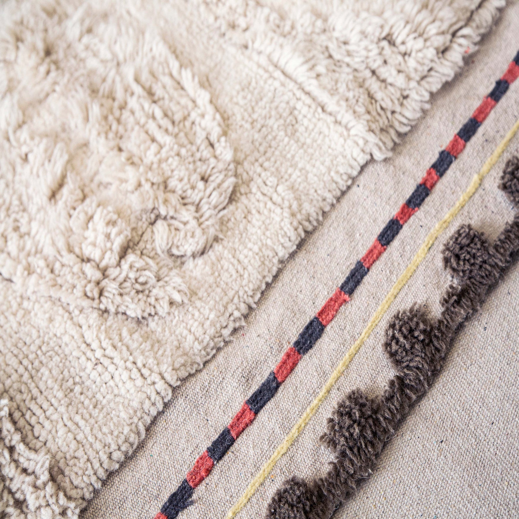 Rectangular wool rug made in natural wool color, using positive and negative effects creating a geometric pattern of silhouettes of cowrie shells throughout the rug, playing with different pile heights. At one of the borders, the rug is finished with visible canvas base decorated with embroidery in Charcoal, Sunlight and Arabesque, and finished with a short pile stitch line in Almond Frost color. A cotton tote bag and a non-slip underlay are included with every rug. This is a unique artisan piece, carefully designed by Lorena Canals and sustainably handcrafted in our own factory using natural fibers and upcycled materials, non-toxic dyes, and a firm commitment to the planet and people. From the design process, to material sourcing and production, we always choose options that minimize waste and ensure long-lasting designs. This product is made with RWS-certified wool. The RWS is a voluntary global standard that addresses the welfare of sheep and of the land they graze on.