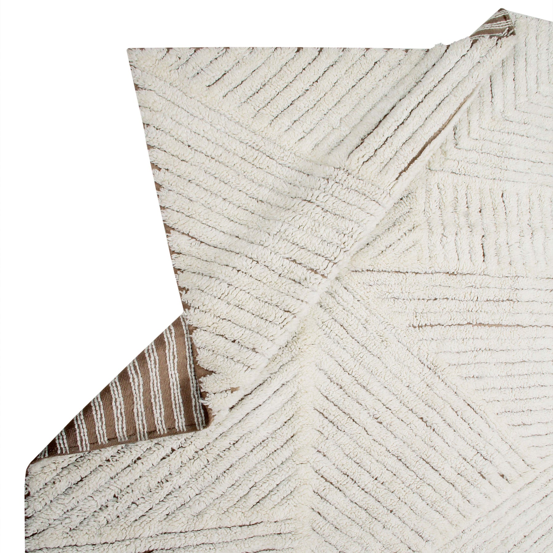 Inspired by a landscape of cultivated fields, this rectangular wool rug has been elaborated using the contrast of the cotton canvas base in Linen color, visible in between the short pile wool in Natural color. A cotton tote bag and a non-slip underlay are included with every rug. This is a unique artisan piece, carefully designed by Lorena Canals and sustainably handcrafted in our own factory using natural fibers and upcycled materials, non-toxic dyes, and a firm commitment to the planet and people. From the design process, to material sourcing and production, we always choose options that minimize waste and ensure long-lasting designs. This product is made with RWS-certified wool. The RWS is a voluntary global standard that addresses the welfare of sheep and of the land they graze on.