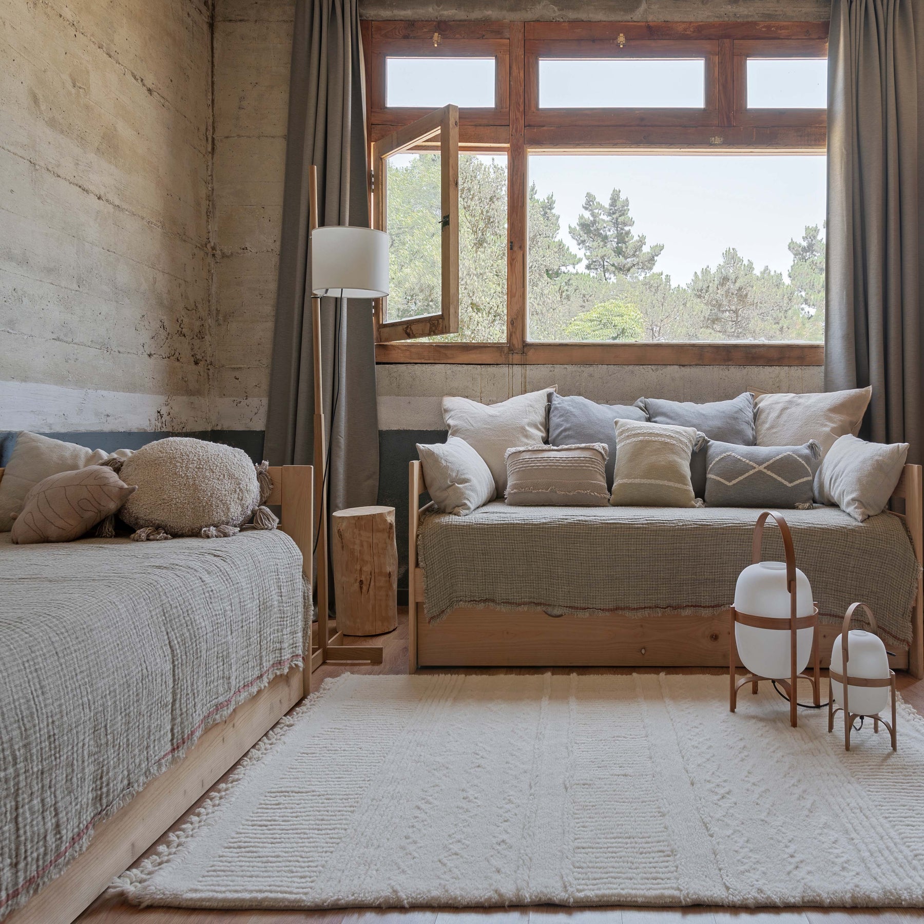This Ari Sheep White rug brings together various tufting techniques to create a soft, multi-textured surface, combining vertical and horizontal strokes with criss-crossing lines to simulate braids and playing with different layers of tufting. Allover Sheep White in color and finished at edges with hand twisted fringes. This is a unique artisan piece, carefully designed by Lorena Canals and sustainably handcrafted in our own factory using natural fibers and upcycled materials, non-toxic dyes, and a firm commitment to the planet and people. From the design process, to material sourcing and production, we always choose options that minimize waste and ensure long-lasting designs. This product is made with RWS-certified wool. The RWS is a voluntary global standard that addresses the welfare of sheep and of the land they graze on.