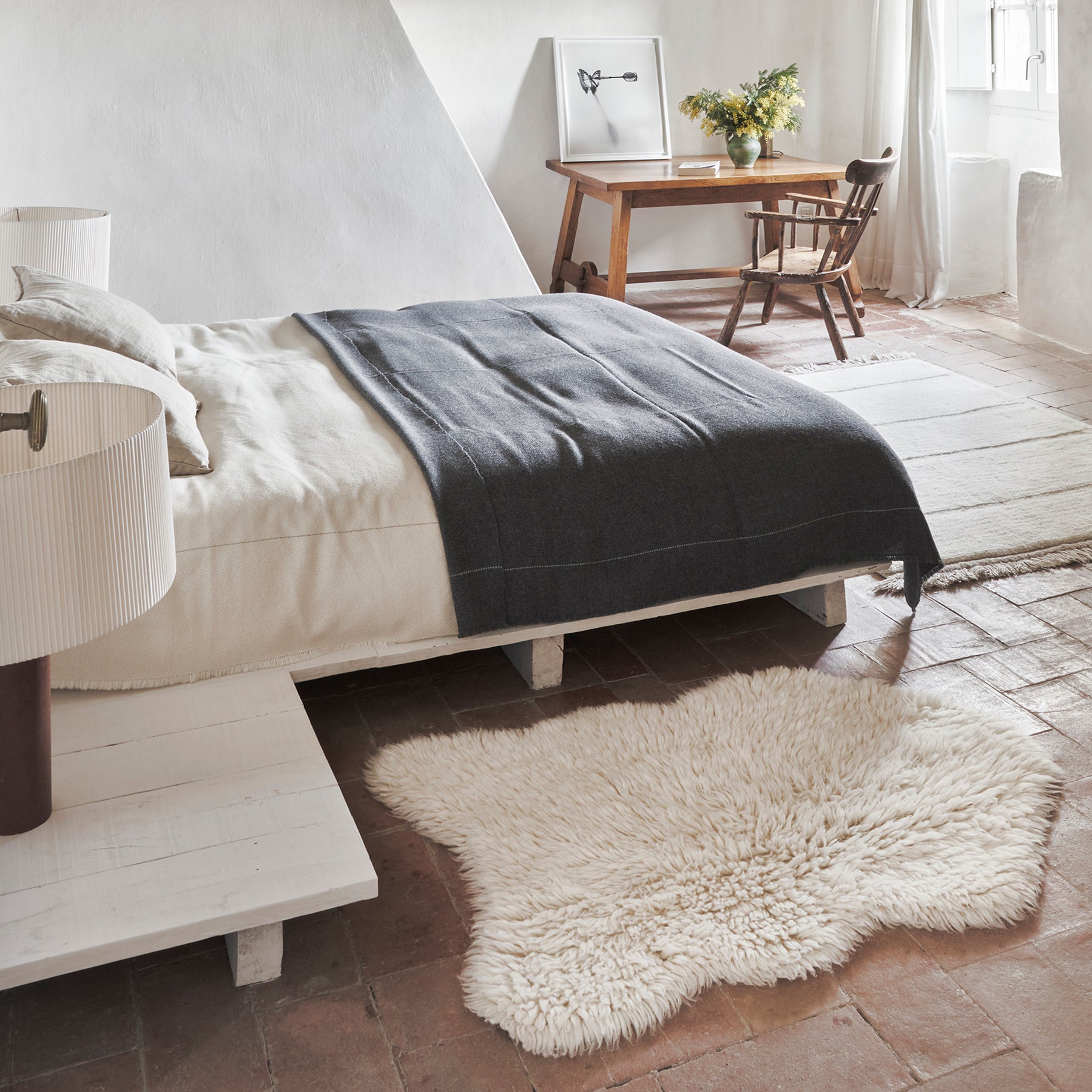 The Woolly rug has rounded shape, imitating the silhouette of a sheepskin, and is made of fluffy wool pile tufted on a cotton base. This is a unique artisan piece, carefully designed by Lorena Canals and sustainably handcrafted in our own factory using natural fibers and upcycled materials, non-toxic dyes, and a firm commitment to the planet and people. From the design process, to material sourcing and production, we always choose options that minimize waste and ensure long-lasting designs. This product is made with RWS-certified wool. The RWS is a voluntary global standard that addresses the welfare of sheep and of the land they graze on.