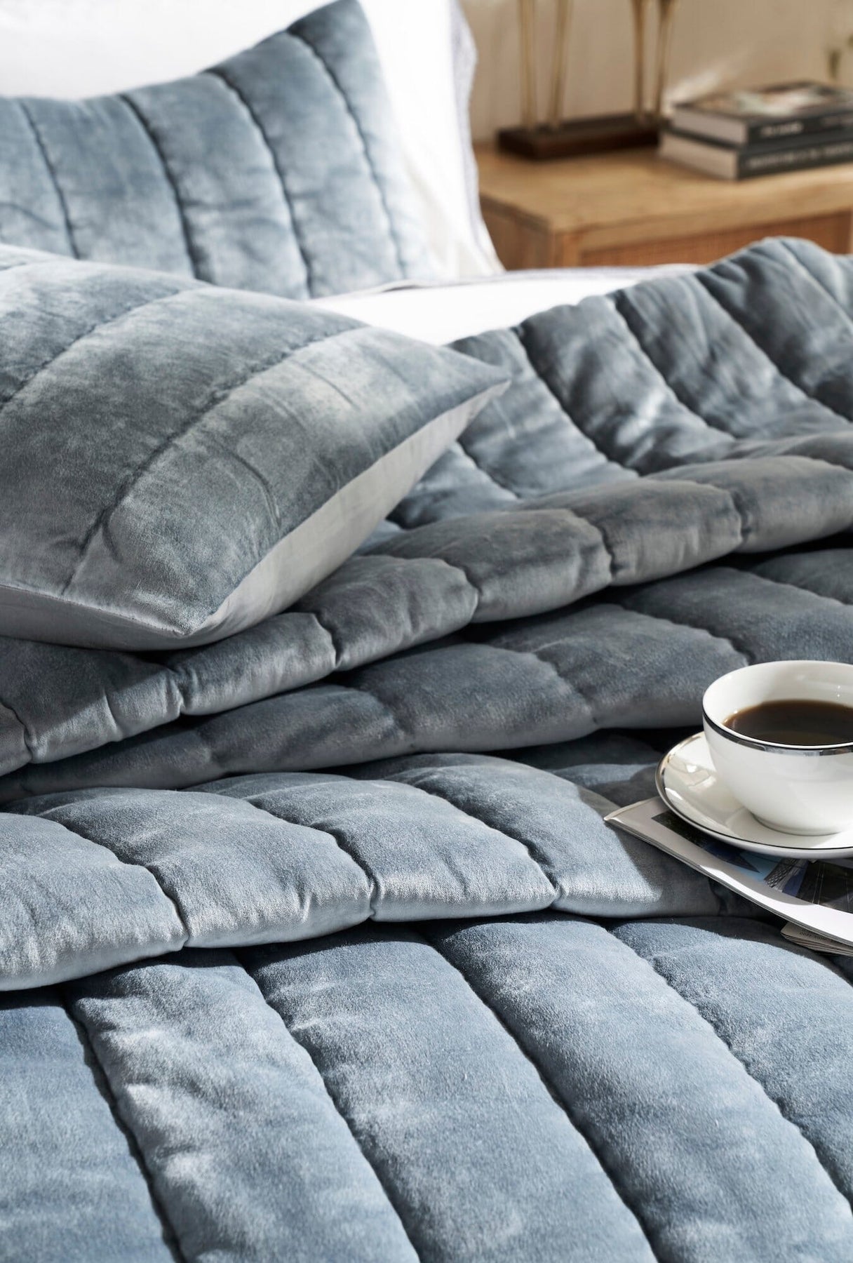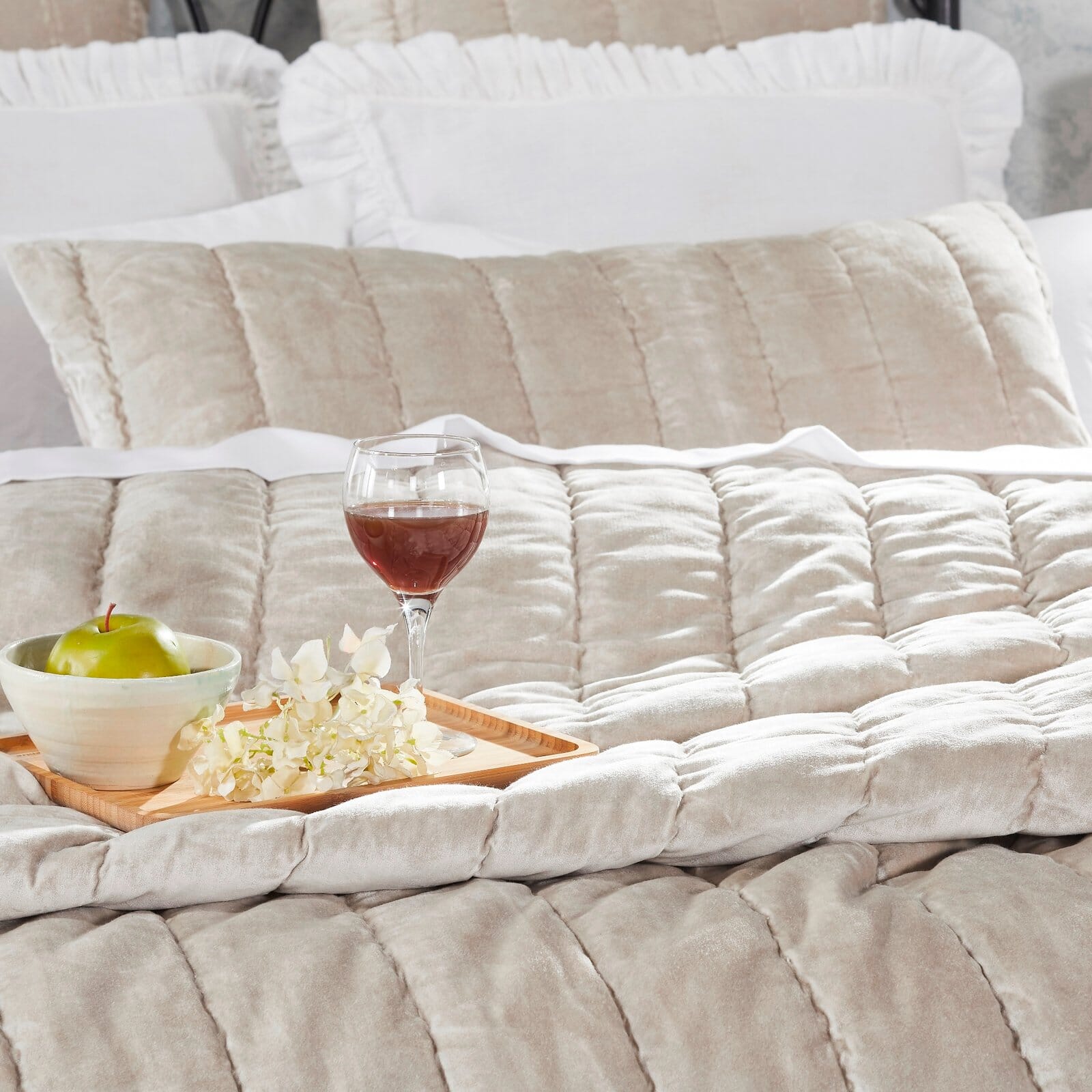 Our Gatsby collection combines the luxurious look of soft velvet front, while the plain cotton reverse feels comforting to sleep beneath. Artfully hand quilted, the quilt is made of fine velvet on a cotton sateen reverse, with both fabrics specially washed to add softness. Its a gorgeous choice for adding extra warmth and elegance to the bed which makes it feel lovely in the colder months and wont cause too hot in Summer. The quilt is simple but striking design features wide channel stripes, all stitched by hand.