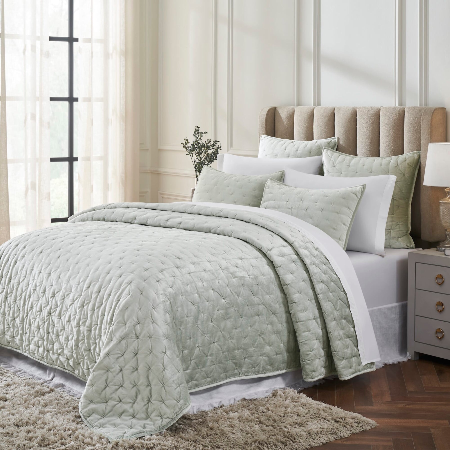 The Luna quilt collection is created using a soft plush velvet, cool, sensual and striking in its look and feel. Its irresistible texture adds romance and drama to any bedroom.