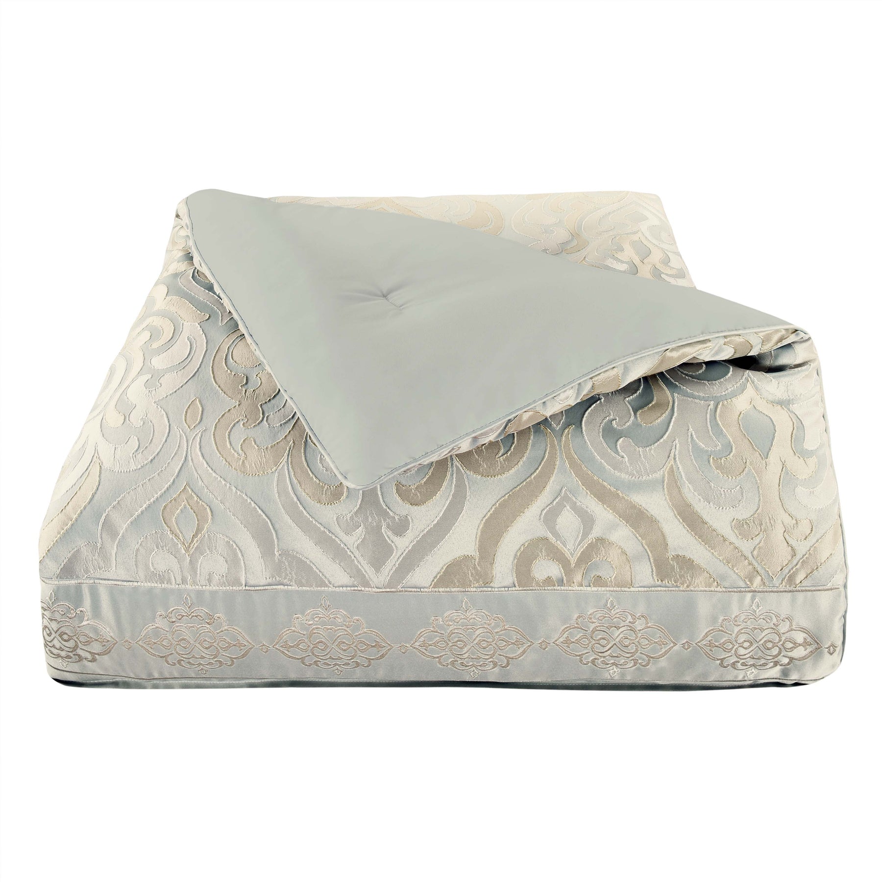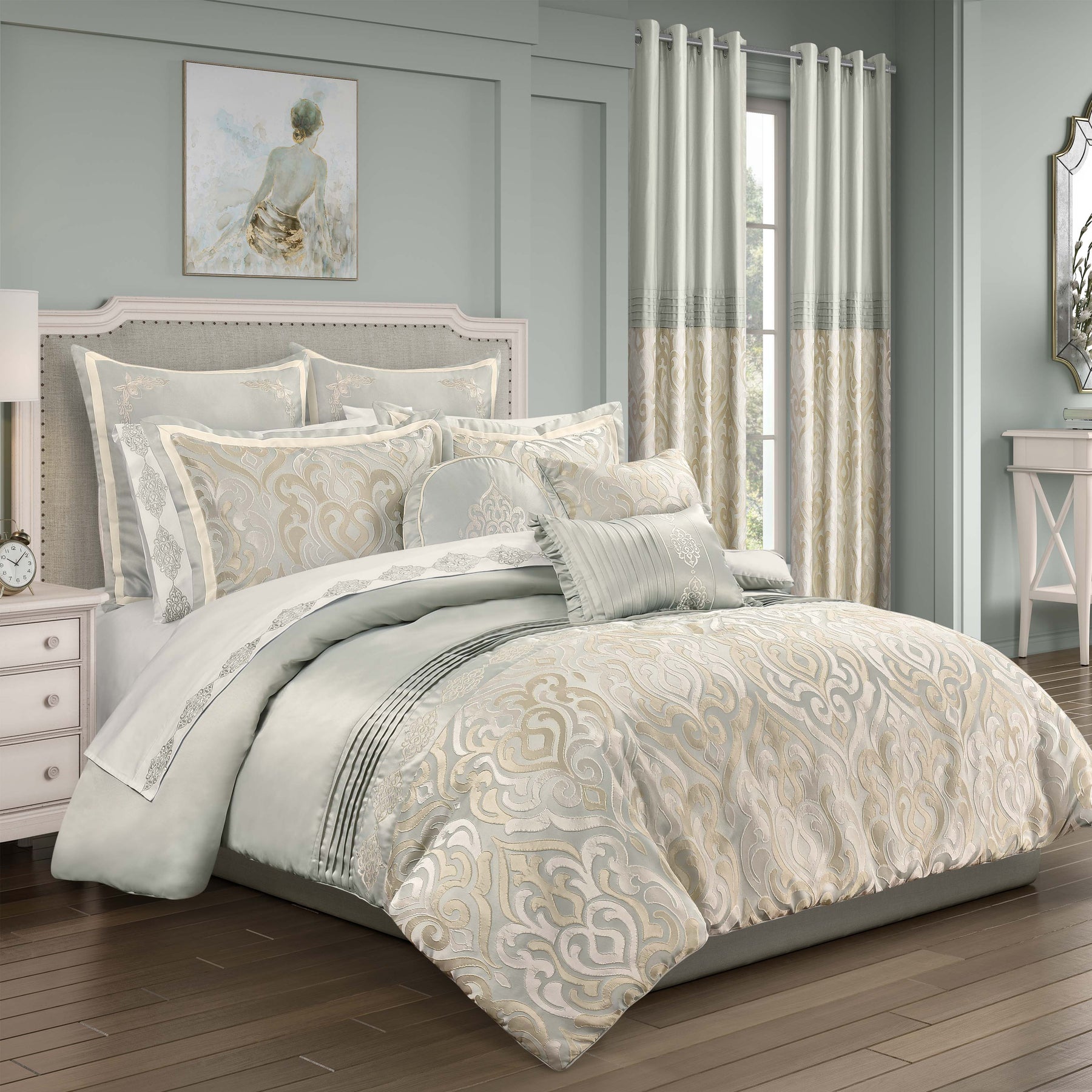 Experience the essence of timeless design with the calmfield comforter set. This luxurious bedding ensemble features a grand-scale damask pattern in stunning shades of aqua, cream, and gold hues. The comforter is the perfect weight for all seasons and includes two coordinating pillow shams. Complete the set by adding the calmfield euro shams, throw pillows, and window treatments to refresh the look of your home.