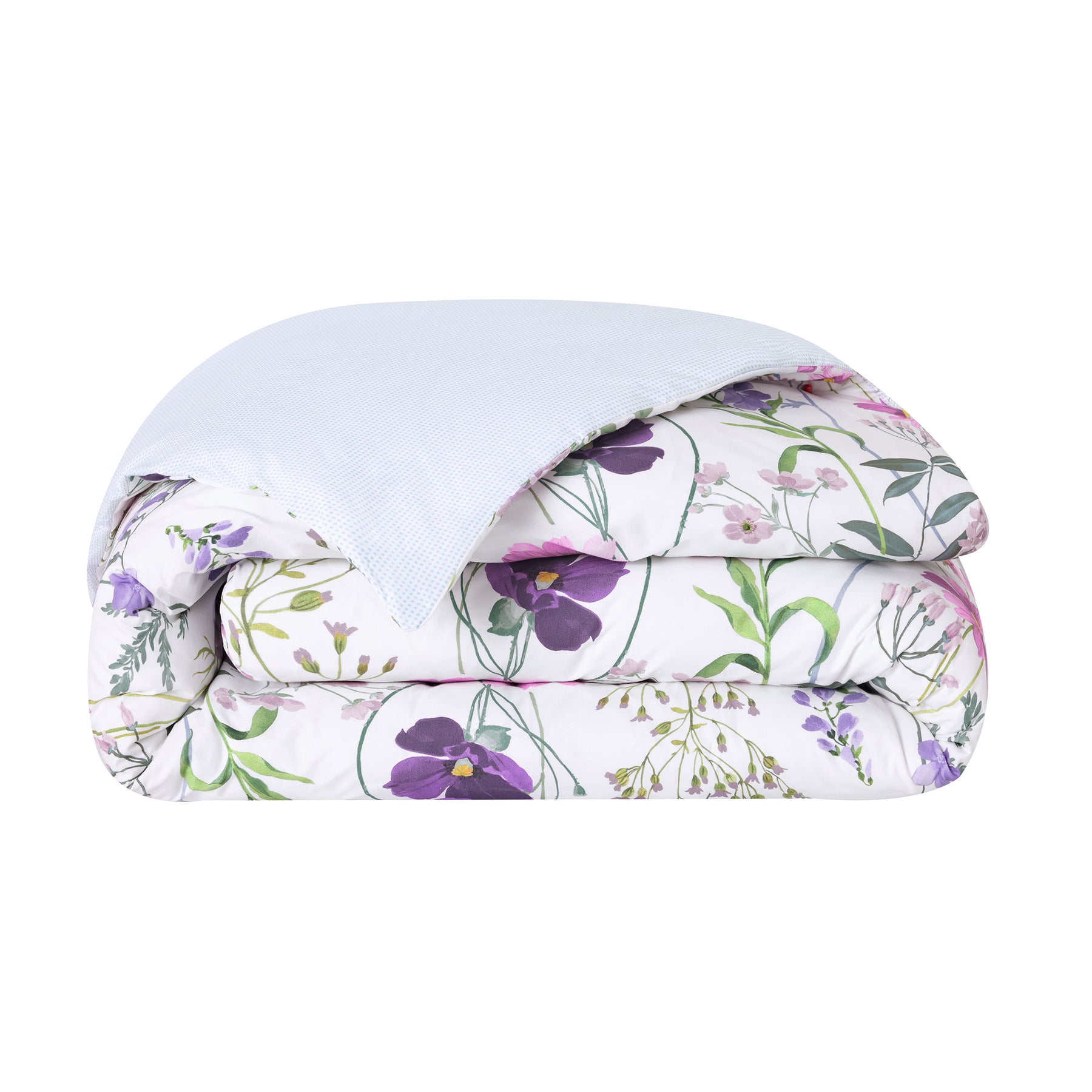 Éphémère is a delightfully modern floral design of fresh garden flowers, watercolor painted in a most artistically handsome way and coordinated with a chic geometric dot print. Buttercups, cosmos, freesia, and poppy flowers bloom in a contemporary scale and layout, evoking a sense that true beauty is revealed in authenticity, naturalness, and the gentle acceptance of the ephemeral. This philosophy invites us to slow down, to contemplate the subtle details of the world around us and to soak up its fragile poetry. Let’s celebrate the splendour of flowers, in all their chromatic richness. At the heart of this palette, the plum purple color imposes its majestic and profound presence, evoking both mystery and serenity. Éphémère duvet covers have the fresh flowers print on once side, and the contemporary dots print on the reverse side.