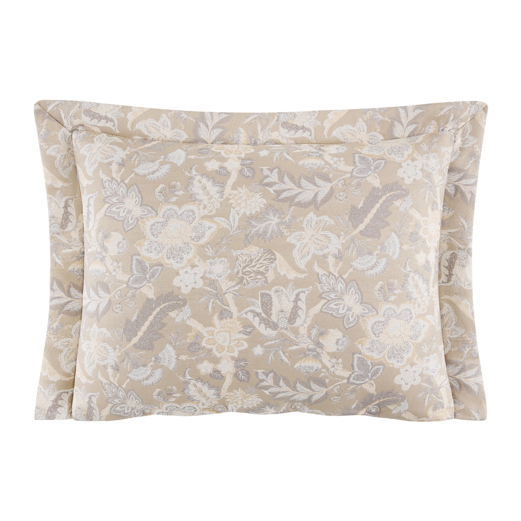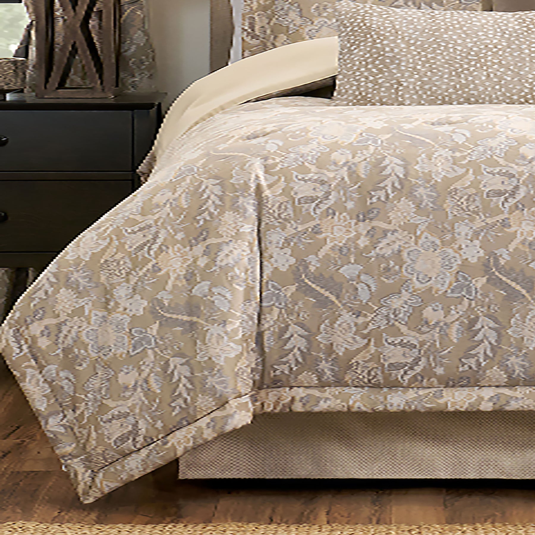 Transform your bedroom into a refined retreat with the Hannah Collection by Rose Tree. The woven Jacobean floral pattern brings a sense of enduring beauty, rendered in soft, inviting tones that create a serene and sophisticated atmosphere. The comforter, with its solid sand-colored reverse, offers subtle contrast and added dimension when folded over, making a stunning bedding statement. Coordinating shams mirror the comforter’s design and are detailed with a 2" flange and twist cord inset for a tailored finish. The bed skirt, crafted in a beige woven basketweave with an 18" drop, adds texture and understated elegance to complete the set. Perfect for both master suites and guest rooms, the Hannah Collection blends traditional charm with timeless style. Complete the look with matching decorative pillows and window treatments for a beautifully coordinated, designer-inspired bedroom.