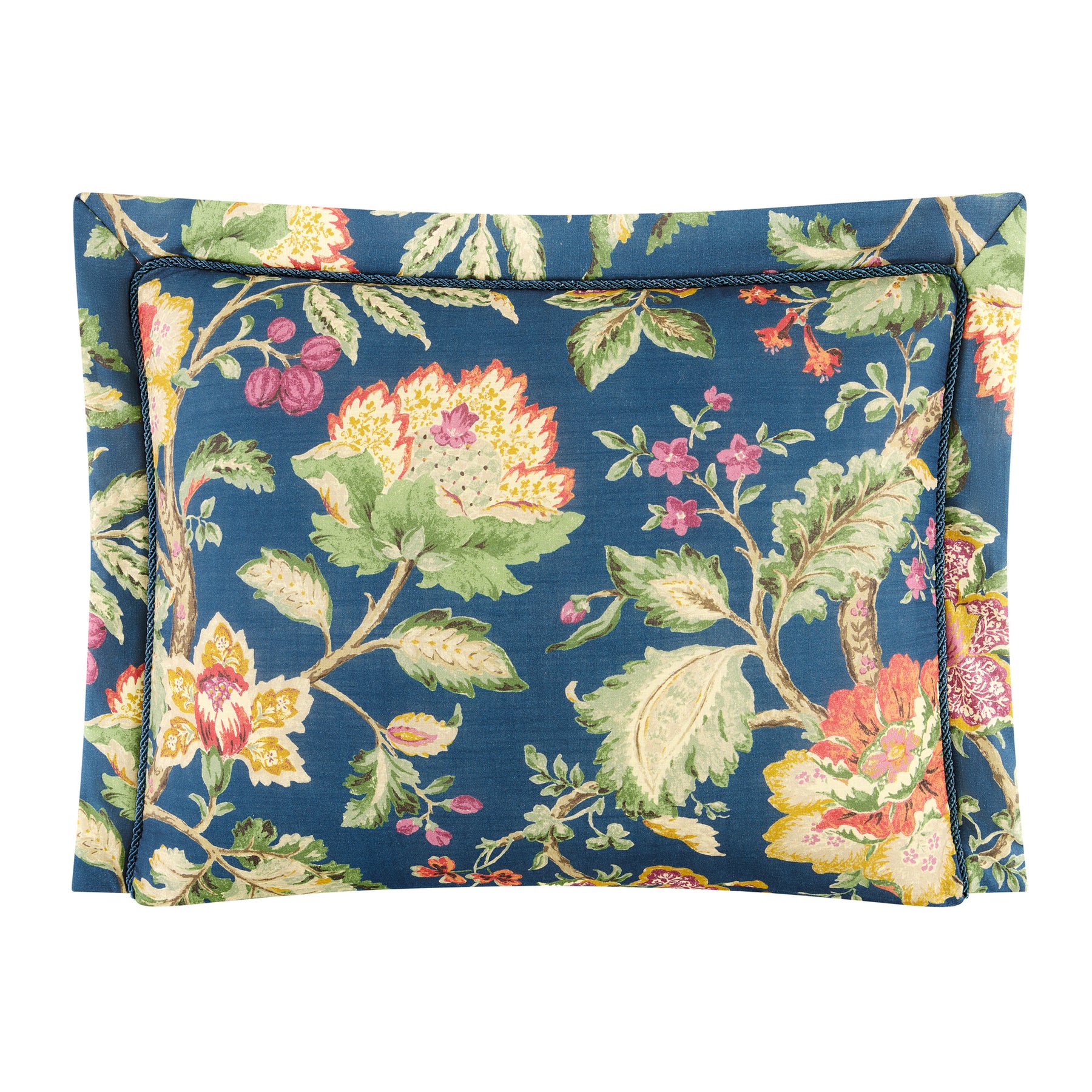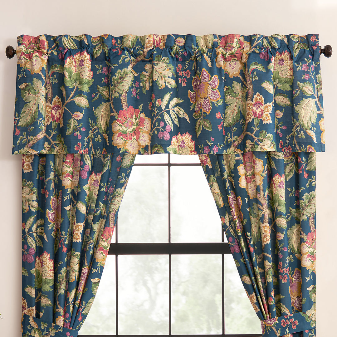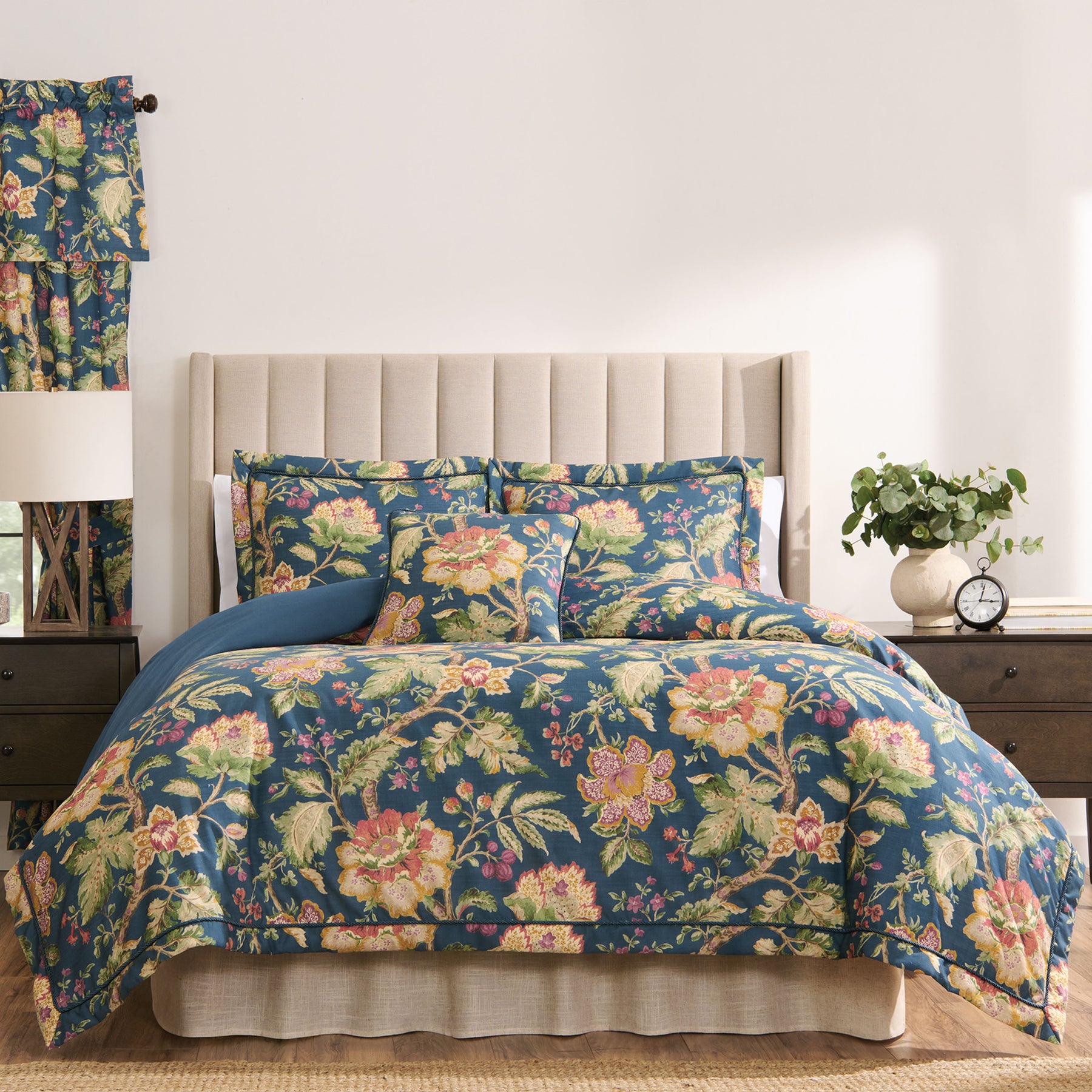 Step into timeless beauty with the Secret Garden Collection by Rose Tree. The comforter showcases a stunning Jacobean floral print in rich tones of green, purple, and rust, all gracefully set against a deep navy ground—a perfect blend of color and sophistication. Designed to bring classic charm into the modern home, the comforter and matching shams are detailed with a 2" flange and contrast twist cord inset, adding tailored dimension and elegance. The look is completed with a woven cream ruffled bed skirt featuring an 18" drop, introducing soft texture and refined contrast to the ensemble. Perfect for both master and guest bedrooms, the Secret Garden Collection transforms any space into a graceful retreat. Pair with the coordinating decorative pillows and window treatments for a fully curated, designer-inspired look—or mix and match pieces throughout your home for a touch of timeless style.