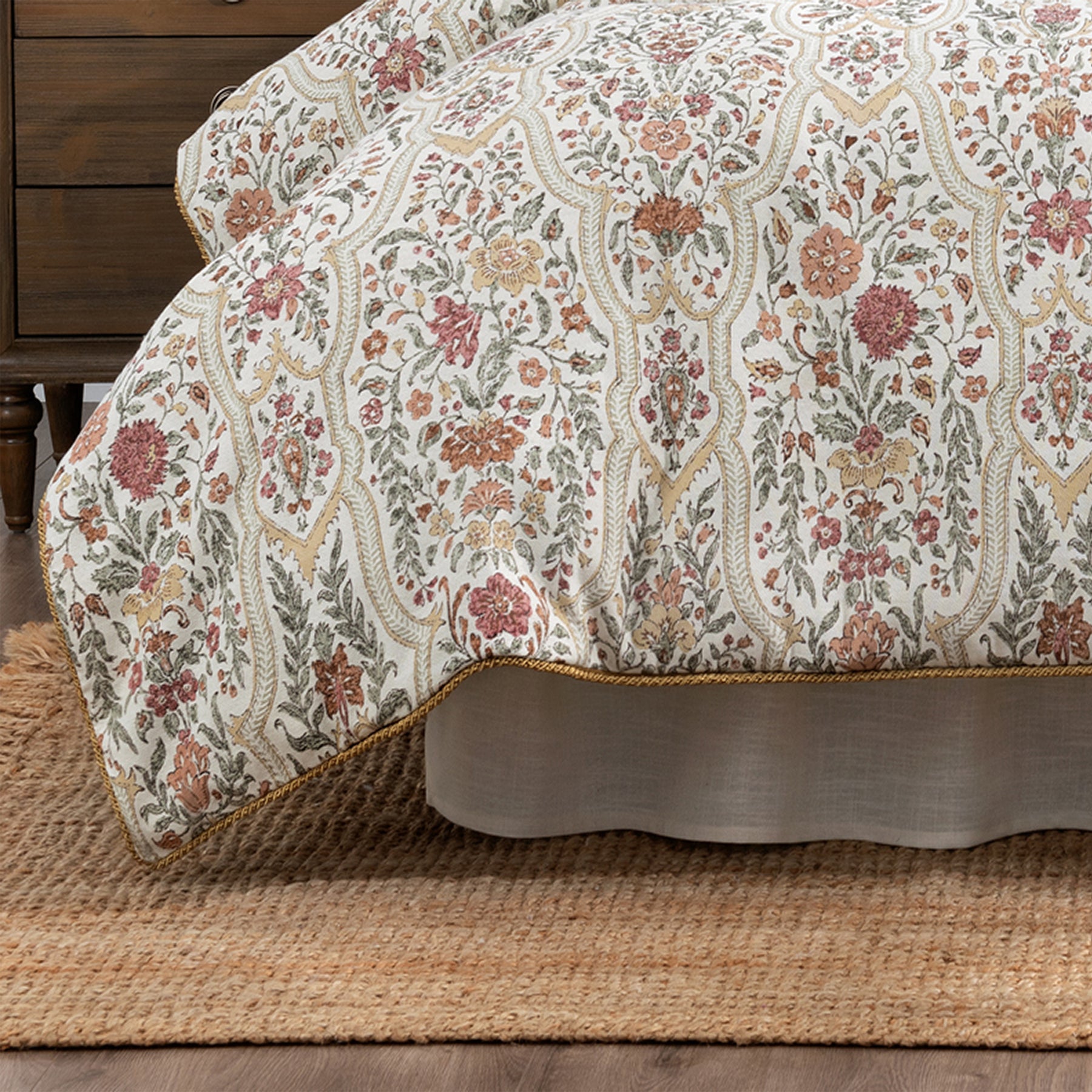 Baroda by Rose Tree – Timeless Elegance, Refined Beauty. Elevate your bedroom with the sophisticated charm of the Baroda bedding collection by Rose Tree. Designed for those who appreciate classic elegance with a touch of warmth, this exquisite ensemble features a seamless woven trellis, gracefully adorned with delicate flowers and leaves. The rich taupe and green tones, accented by soft red floral details, bloom beautifully against a soft cream background, creating a look that is both inviting and refined. The Baroda collection brings effortless elegance with its plush comforter, two tailored shams, and a woven ruffled bed skirt, adding a layer of softness and dimension to your bedding ensemble. Each detail is thoughtfully designed to offer both timeless appeal and modern sophistication. Enhance the look with coordinating draperies, an elegant valance, and decorative pillows, each piece crafted to complement the collection and bring a cohesive, luxurious feel to your space. With Baroda by Rose Tree, your bedroom becomes a haven of grace and comfort, where classic design meets effortless sophistication.