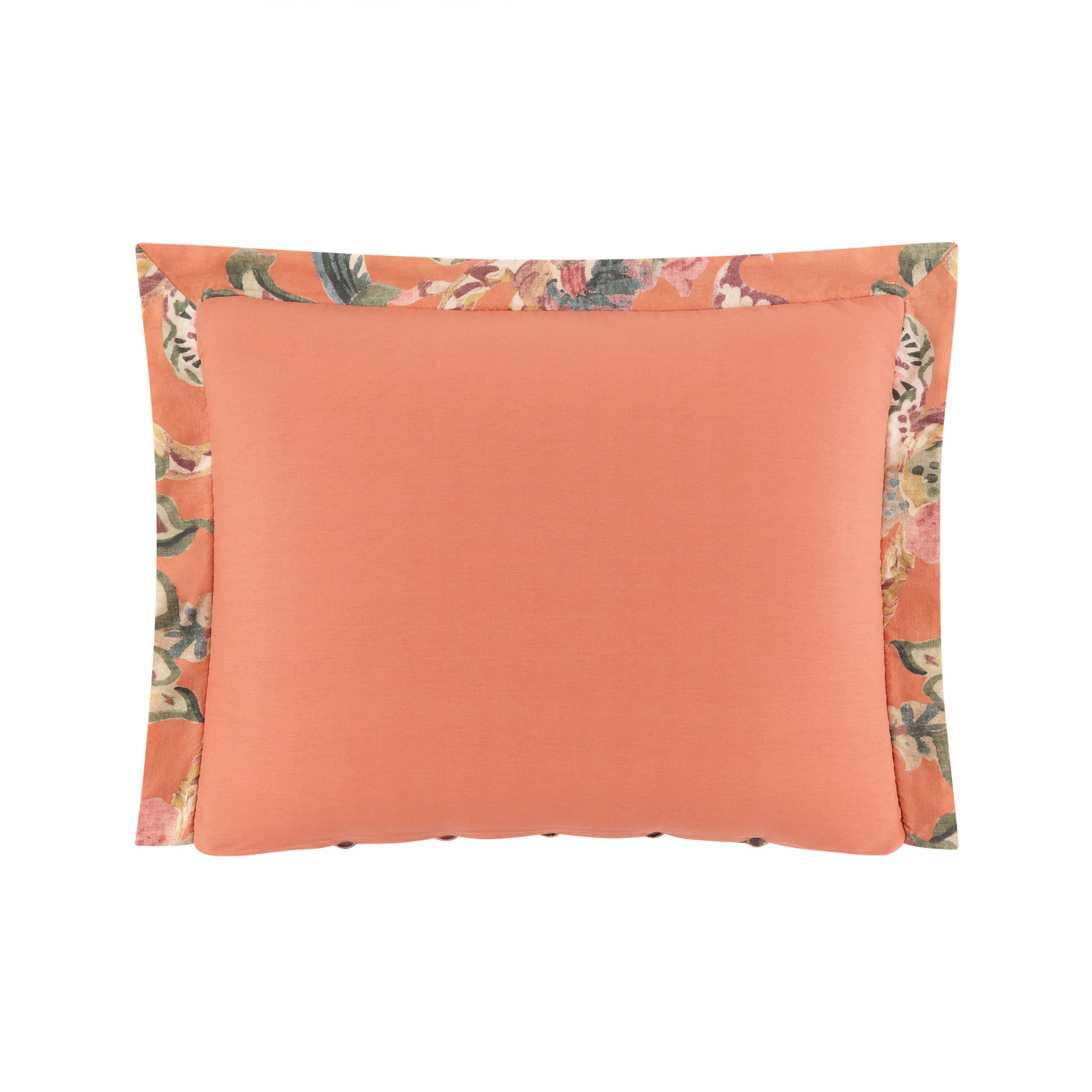 Transform your bedroom into a haven of refined elegance with the Cara Collection by Rose Tree. Defined by its superior craftsmanship and ardent attention to detail, this bedding ensemble exudes modern sophistication paired with timeless charm. Featuring a gorgeous floral design in lovely colors set against a vibrant coral ground, the Cara Collection brings a touch of wanderlust and playful energy to your home decor. The comforter showcases a solid coral reverse and is accented with contrast cord trim details, offering effortless elegance and a polished finish. Coordinating shams are adorned with a 2" flange trim and inset contrast cord trim, adding a tailored, luxurious touch. Completing the ensemble is a ruffled bedskirt crafted in natural-color linen, featuring a generous 18" drop and split corners for a graceful drape. Perfectly blending modern elegance with updated classical styling, the Cara Collection elevates your space with vibrant beauty and sophisticated comfort.
