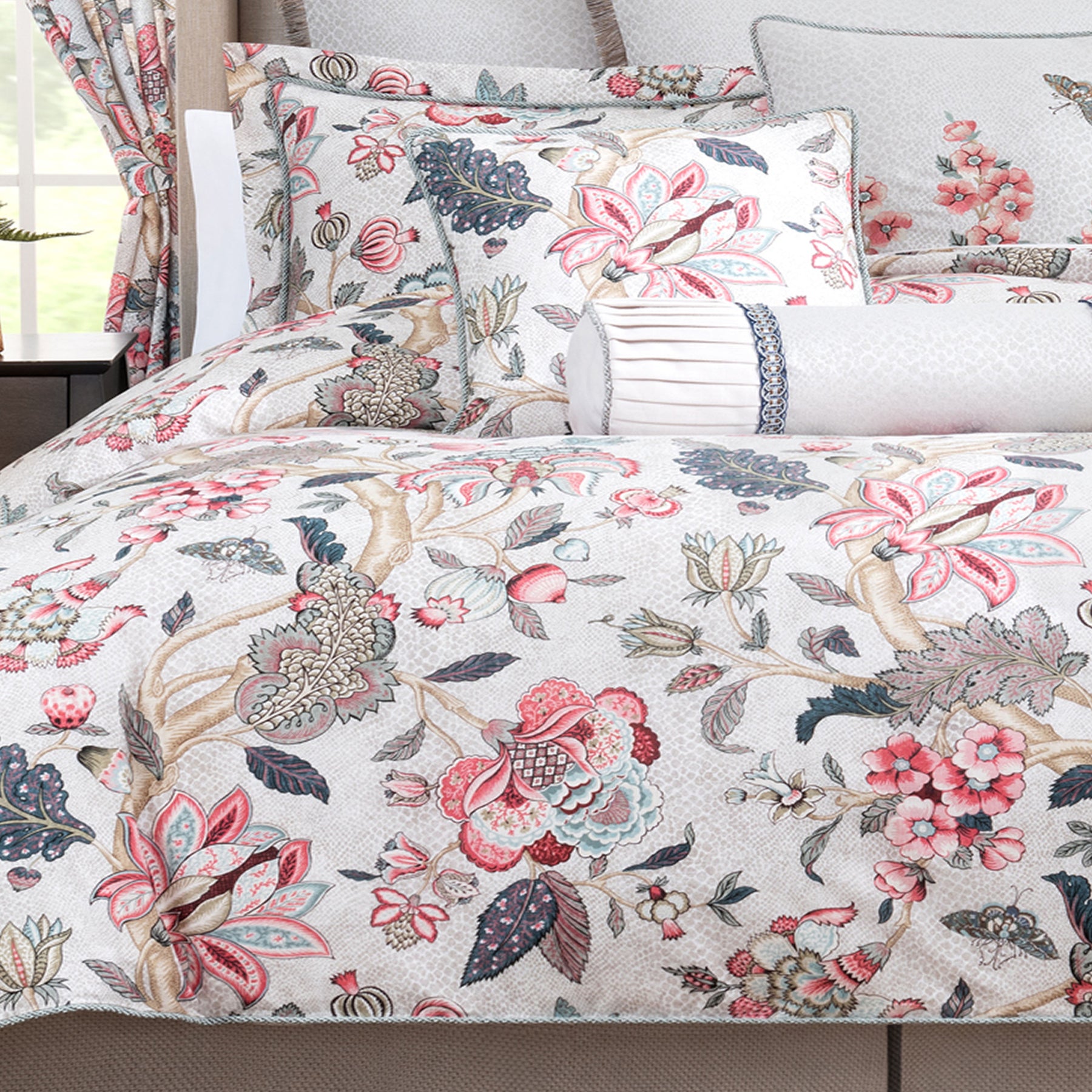 Talia comforter showcases a Jacobean floral print set against a subtle animal pattern, creating a beautifully layered design.