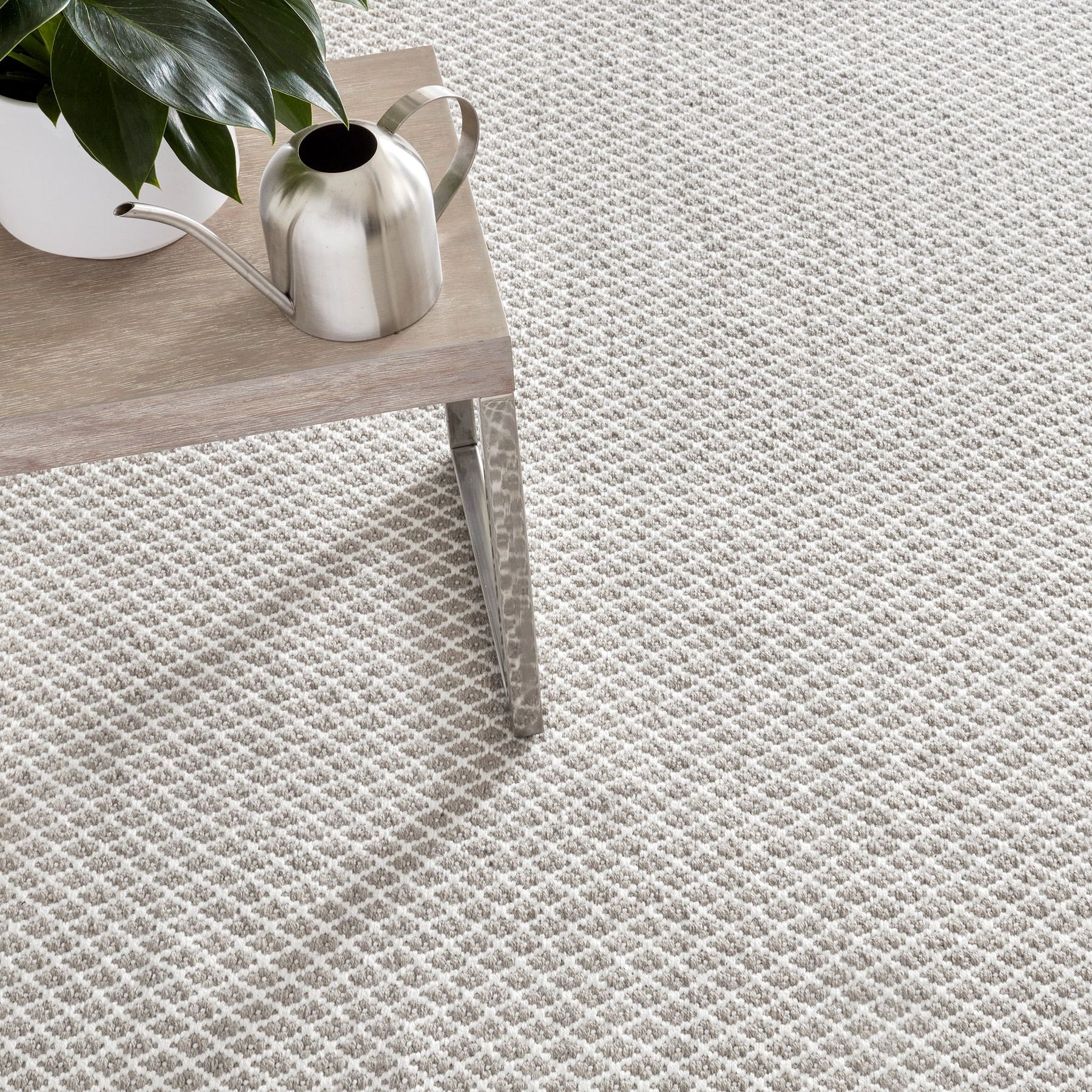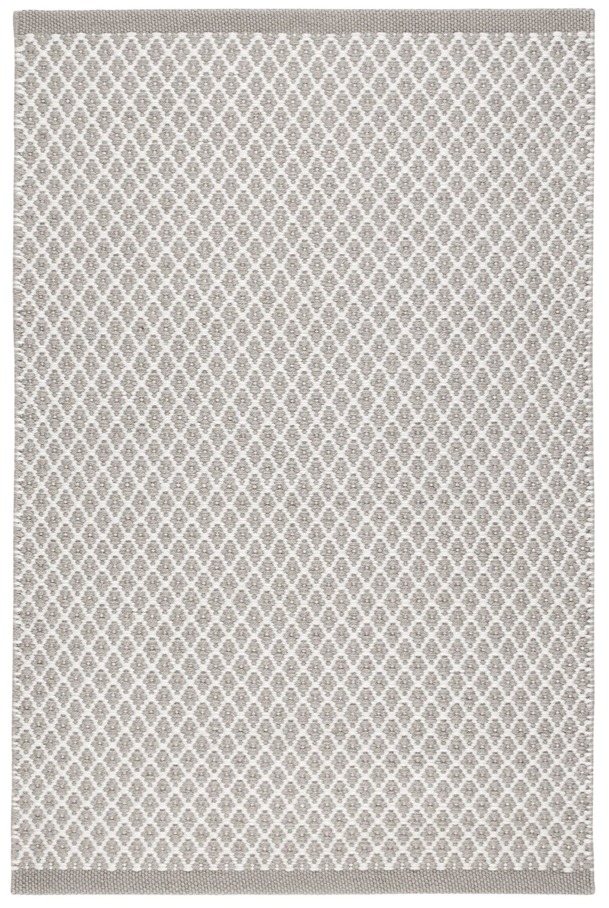 A classic lattice diamond in sophisticated grey and ivory color combo offers subtle geometric interest on a durable washable floor covering. Made of eco-friendly 100% PET, a soft-handed fiber from recycled plastic bottles.