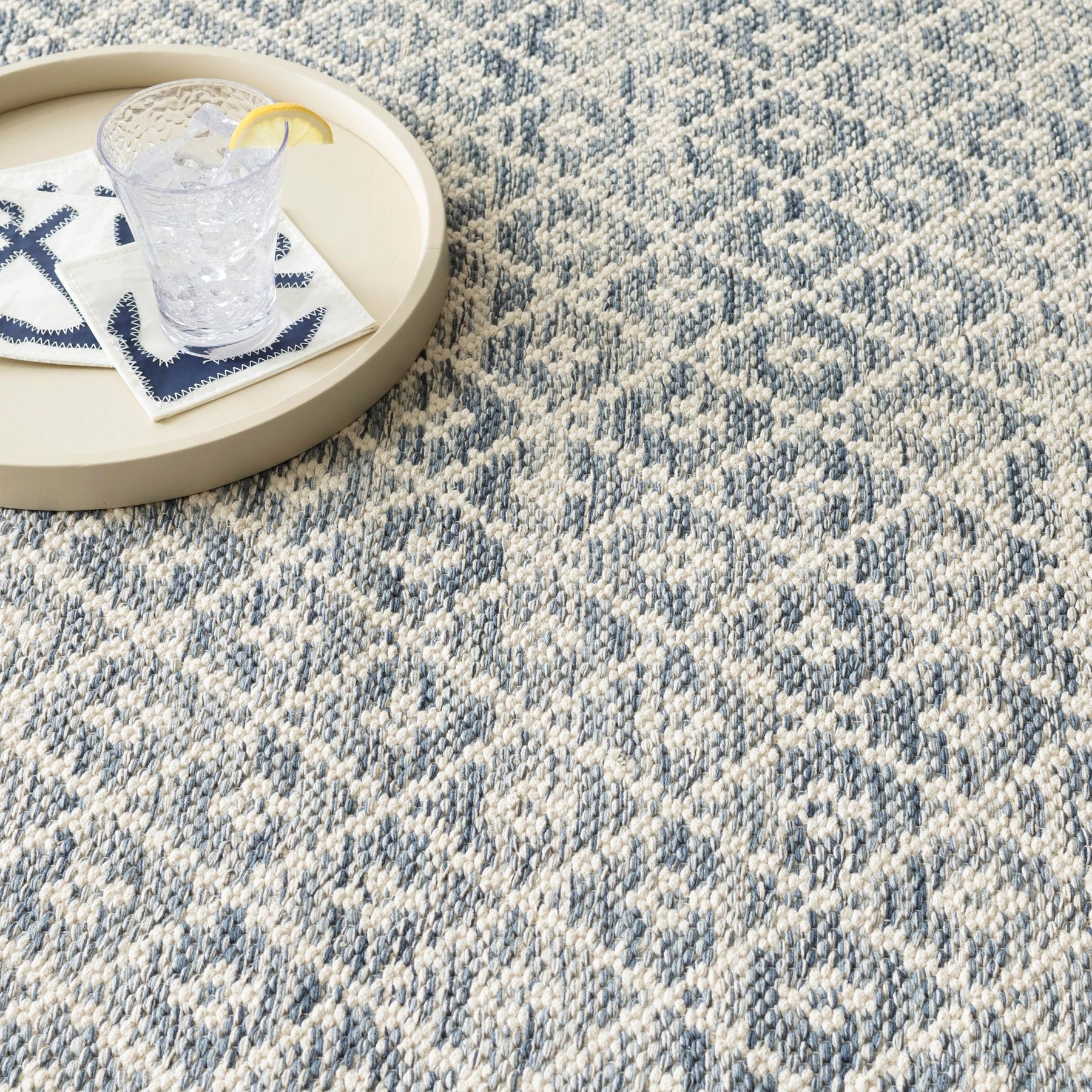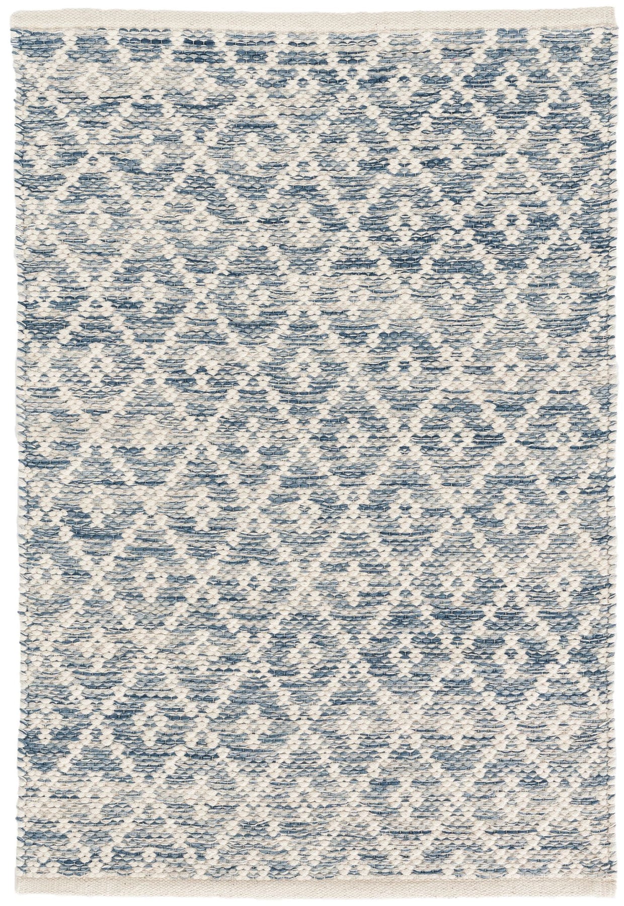 Lightweight, easygoing flatweave cotton rug with a classic diamond pattern made new with a faded melange of monochromatic mineral blues.