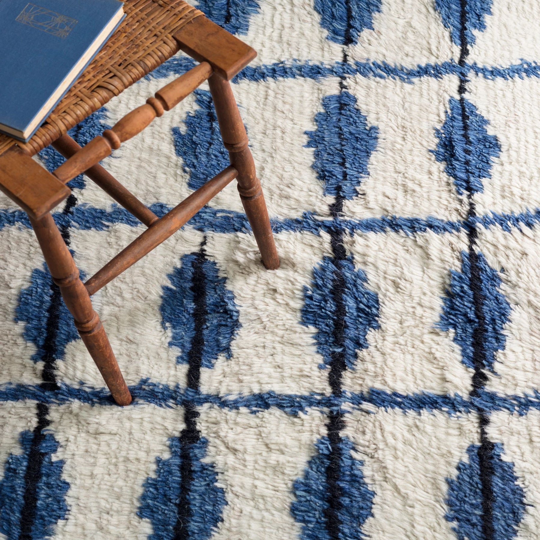 Sumptuous and shaggy, the Noma Handwoven Wool Rug has a plush pile of undulating ivory tufts with an ink-colored diamond design. The perfect rug for adding softness and style to a bedroom, living room, or family room.
