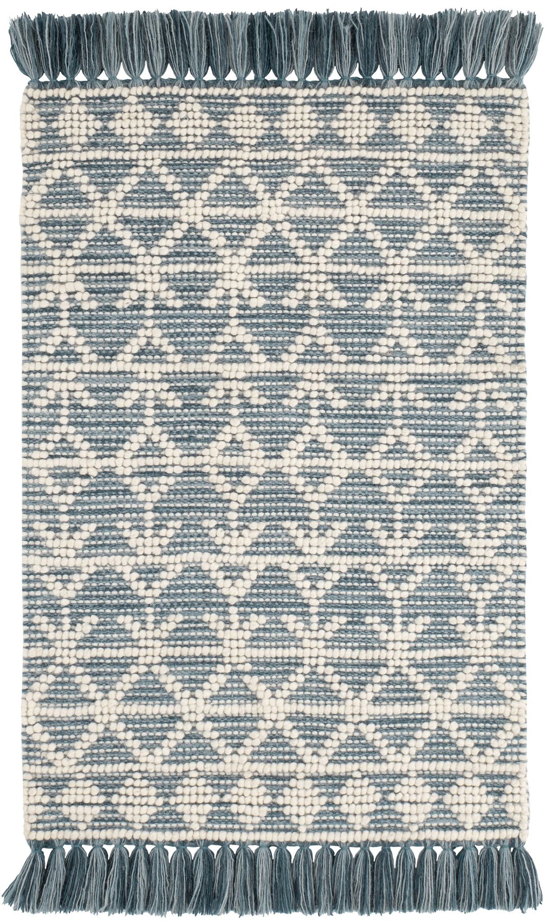 The Pembrook Handwoven Wool Rug has an intricate, Fair Isle-inspired pattern made from raised ivory loops on a flatwoven background. Durable and soft, with a classic knotted fringe to complete the look.