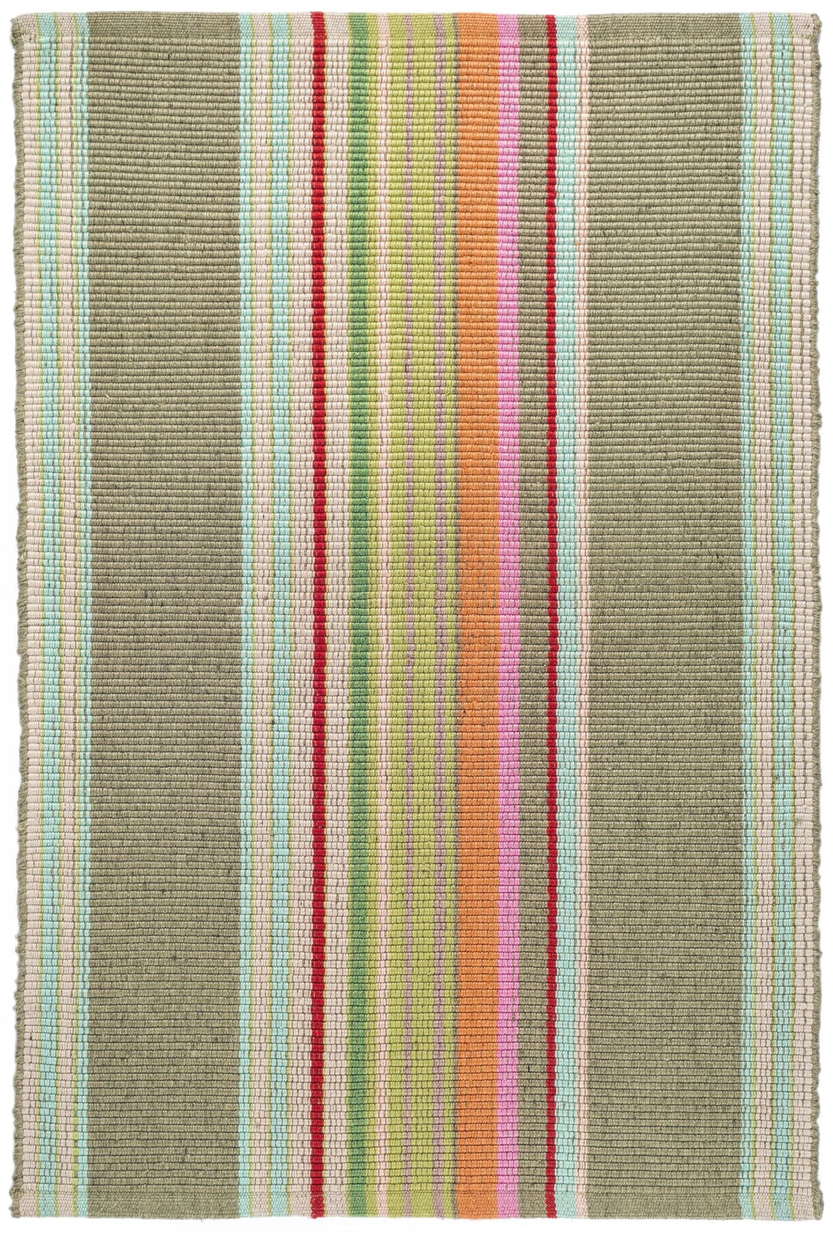 Bright stripes of red, orange, pink, citrus, and sky pop against sage green on this eco-friendly and washable indoor/outdoor rug made of recycled polyester. Use this rug as a punch of color in high-traffic areas like the entryway, stairs, or kitchen.
