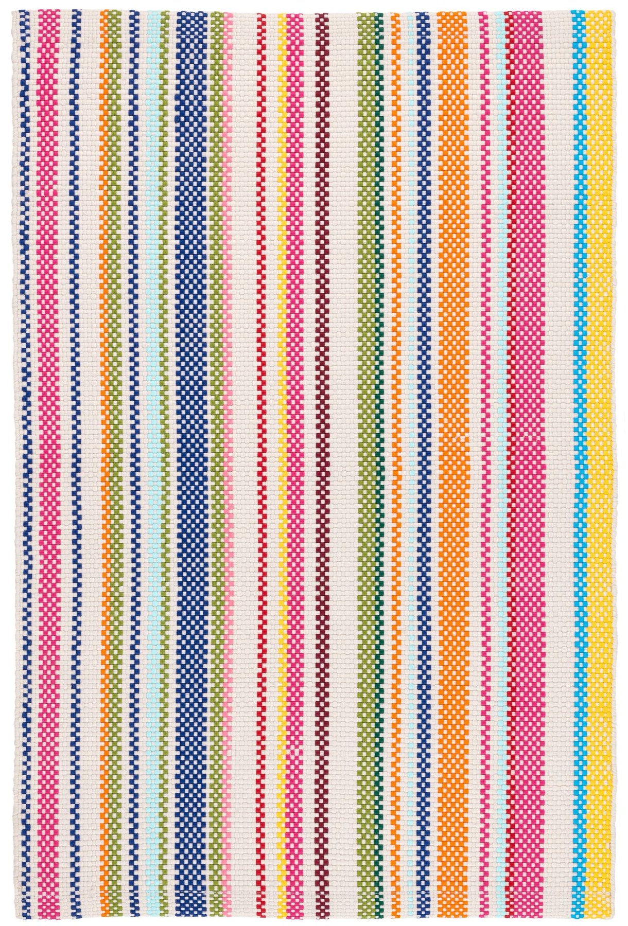 Vertical chambray stripes of Navy, Sprout, Lemon, Tangerine, Fuchsia, Pink, French Blue, and Turquoise weave their way down a simple white ground in this playful and reversible flatweave rug. Like the rest of our polypropylene indoor/outdoor rugs, it's washable, scrubbable, and bleachable, making it perfect for high-traffic areas such as family rooms, playrooms, or any room that needs playful pops of juicy, delicious color.