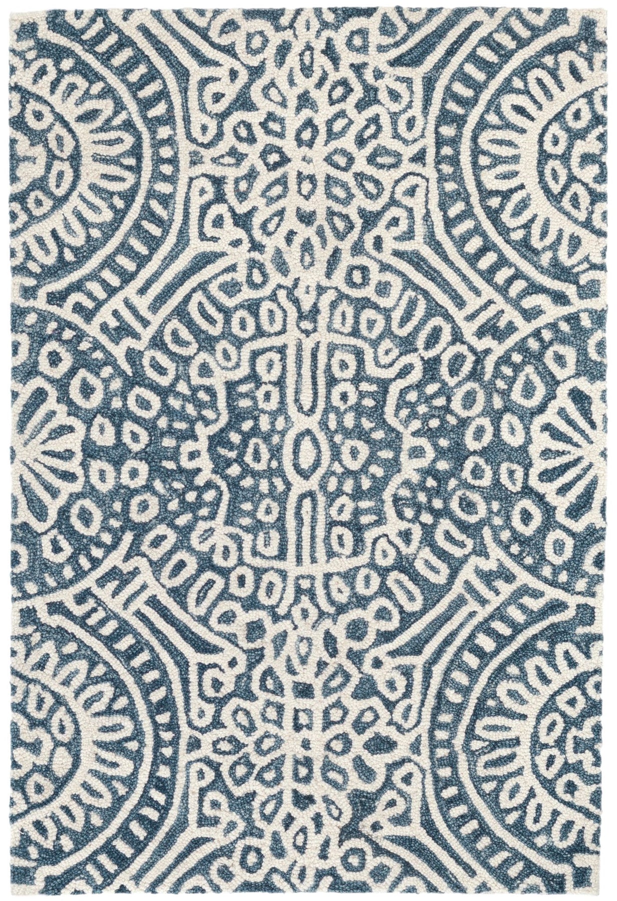 Order a swatch by adding it to your cart. Build a cozy and welcoming sanctuary with this micro-hooked wool rug. Featuring a pattern reminiscent of stained glass on a dark blue background, this area rug brings a bit of serenity and spirit to any space it inhabits.