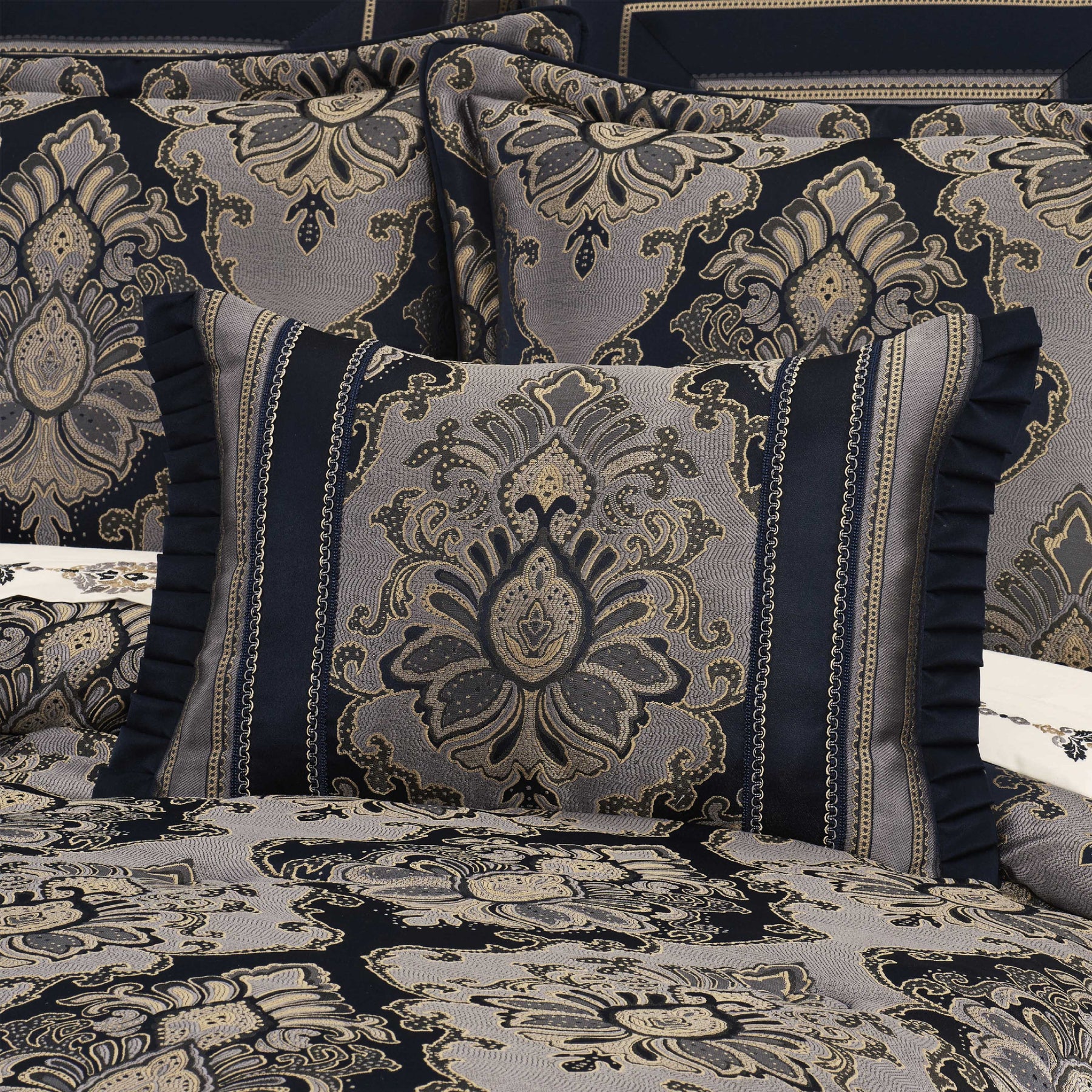 The bradley boudoir throw pillow features a woven damask pattern in shades of gold and navy blue. It reverses to a vertical woven stripe pattern, gimp trim details, a tassel fringe, and was designed to coordinate with the bradley comforter set and window treatments (each sold separately).