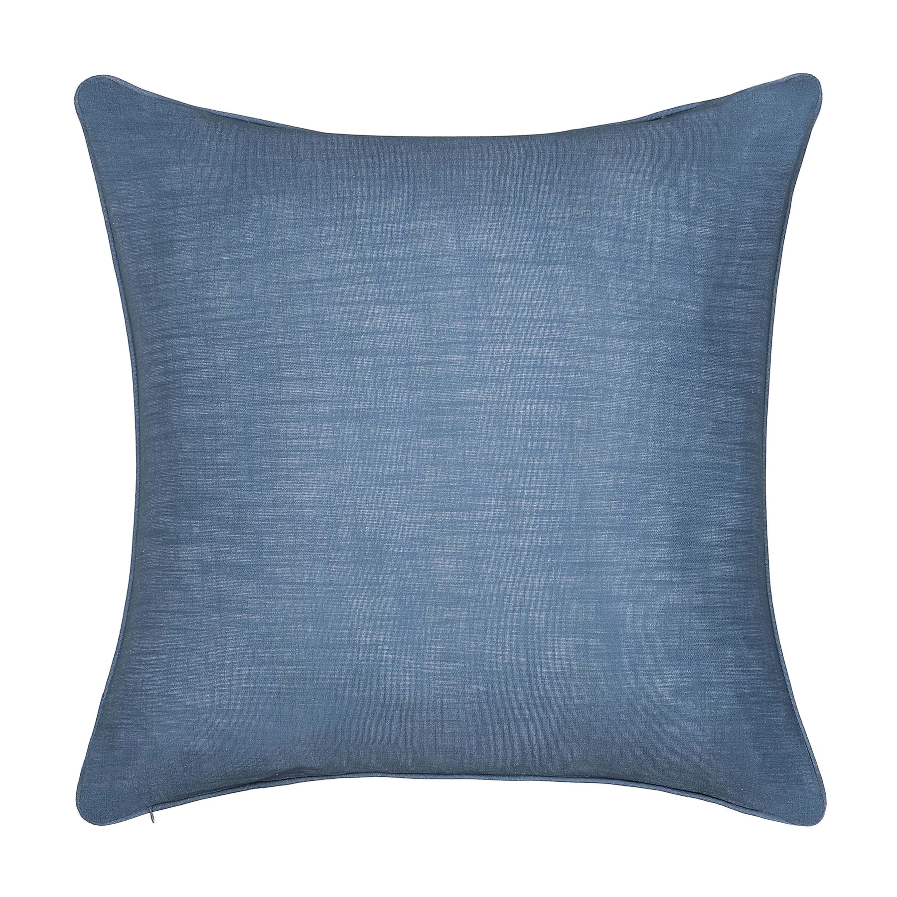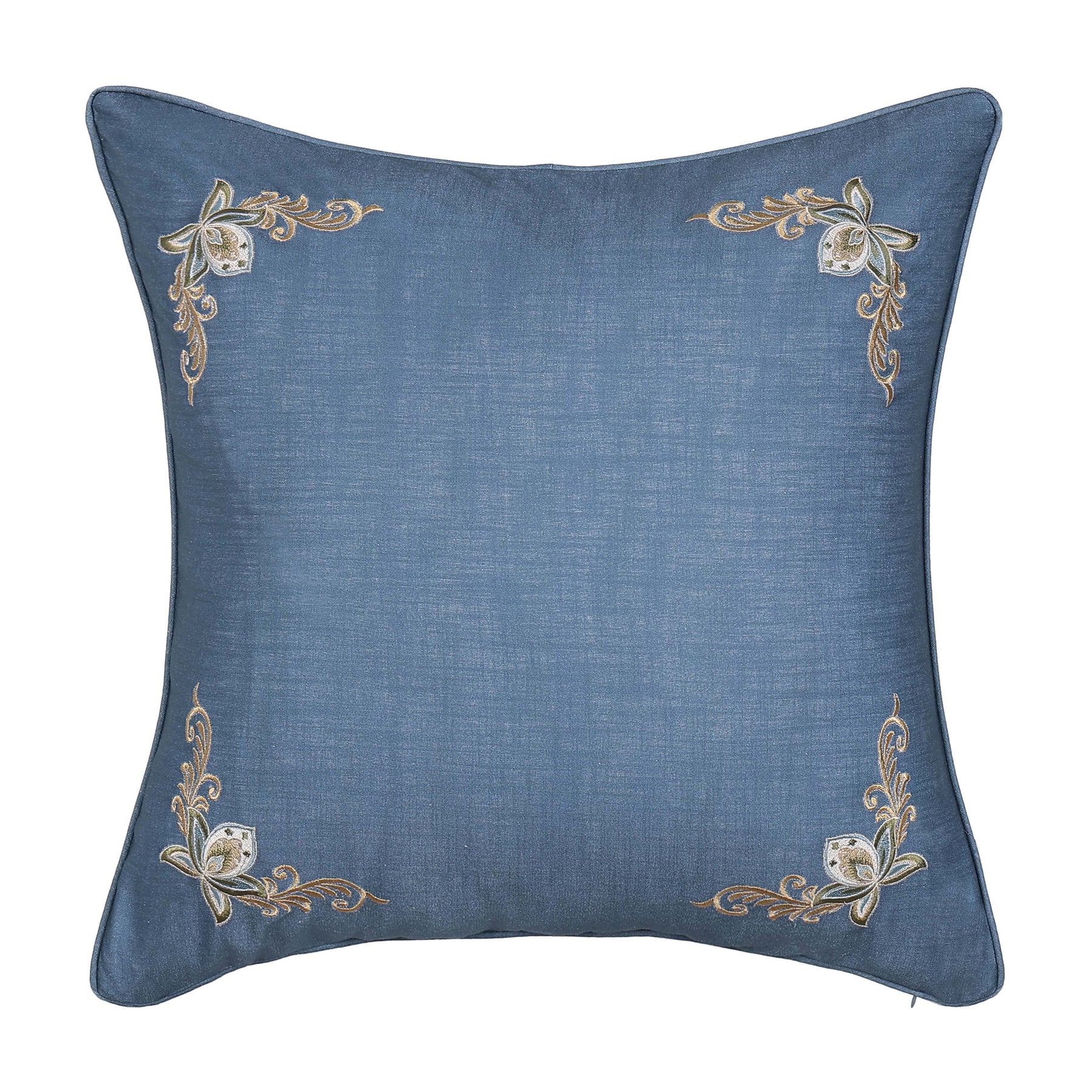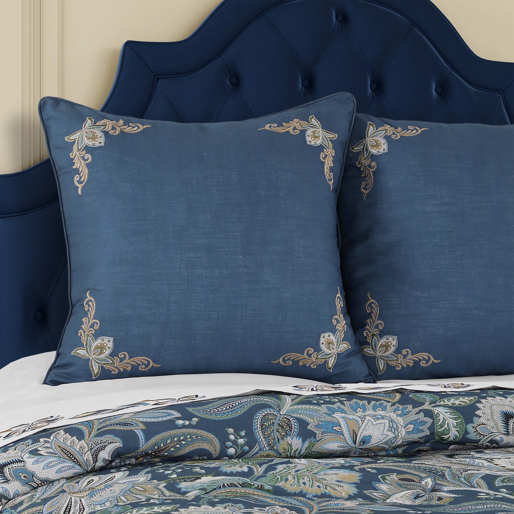 The michaela euro sham features a prussian navy blue woven cotton fabric on the face and reverse. The face is embellished with a multicolored floral embroidery placed in all four corners. The fine details include a hidden zipper closure and 1/4" piping for a tailored finish and backdrop to the michaela comforter set (sold separately).