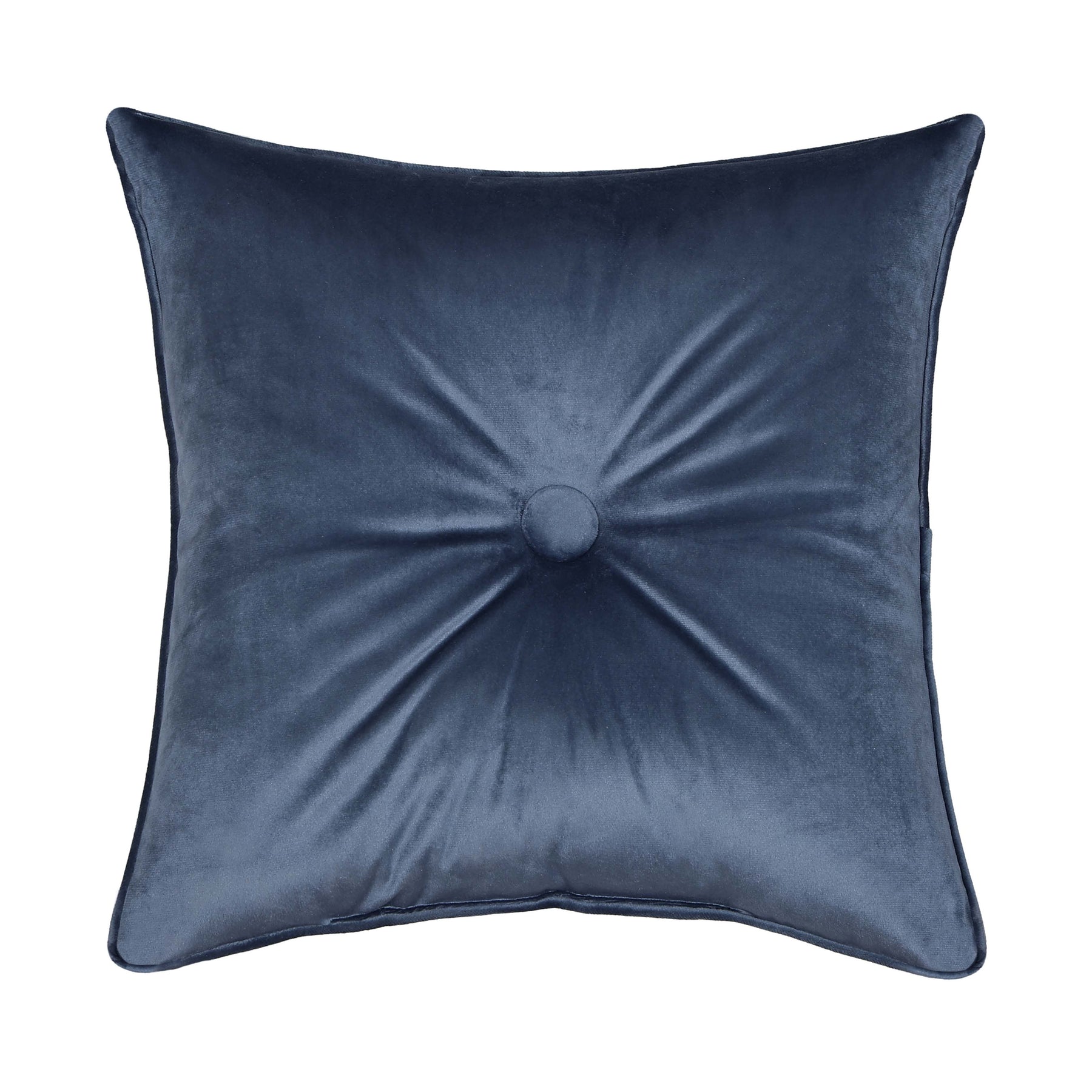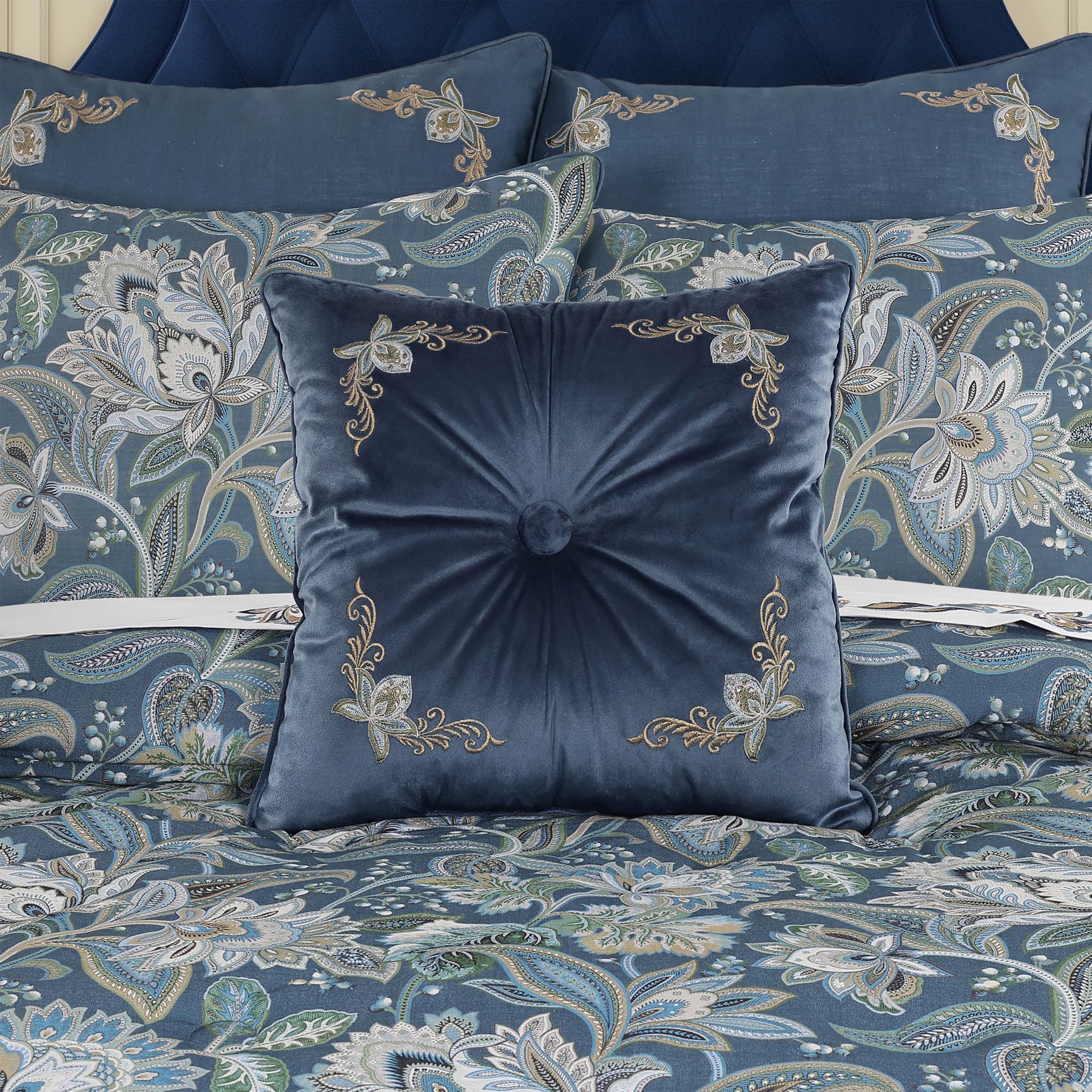 The michaela 18 inch throw pillow is constructed with a tufted fabric covered button accent in a plush blue velvet fabric. The face is embellished with a multicolored floral embroidery placed in all four corners and framed with a 1/4" piping. The coordinating comforter set and accessories are sold separately.