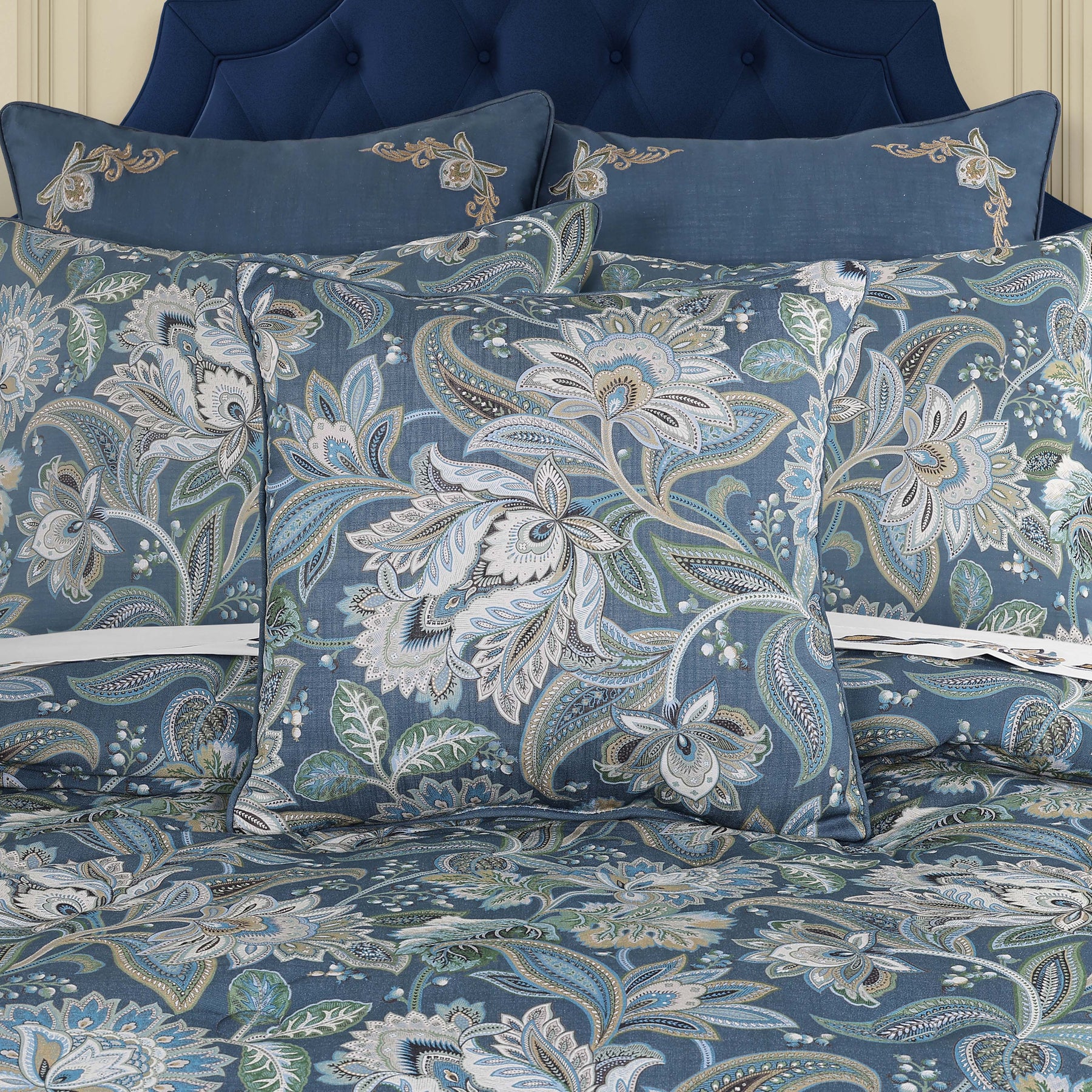 The michaela 20 inch throw pillow features a printed floral jacobean centered on the face in lovely tones of navy blue, gold, and shades of green. The pillow reverses to a woven slub blue fabric and is finished by a 1/4" solid piping. The coordinating comforter set and accessories are sold separately.