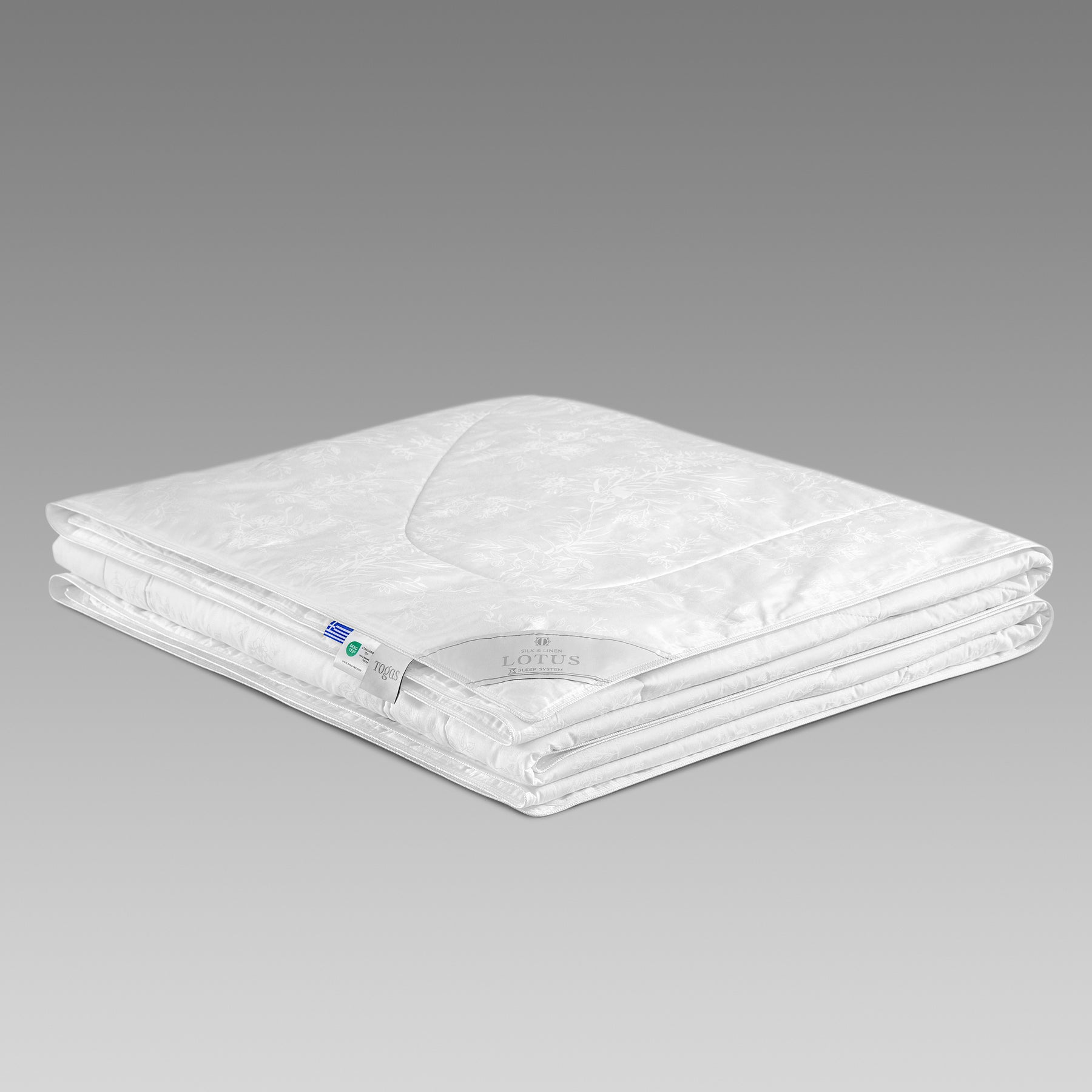 This combination of wonderful natural materials provides climate control, maintains a comfortable body temperature for a sleeping person. The silk and linen holds unique antibacterial properties, and hypoallergenic fibers. Products containing these qualities provide a high amount of hygiene for whoever is using them. The silk consists of proteins, trace elements, and amino acids, which have a positive effect on the human body. It is a very soft and delicate material. Flax perfectly absorbs moisture, has a high degree of breathability, and is very durable. The combination of linen and silk in the Lotus duvet insert provides a combination of their best properties. The cotton jacquard cover of this model is the key to the long service life of the duvet insert and its durability. Along the perimeter of the duvet insert, there is sewn edging with double stitching, which gives special strength and elasticity to the edges of the product. The duvet insert is quilted with a special anatomical stitch, patented by Togas.