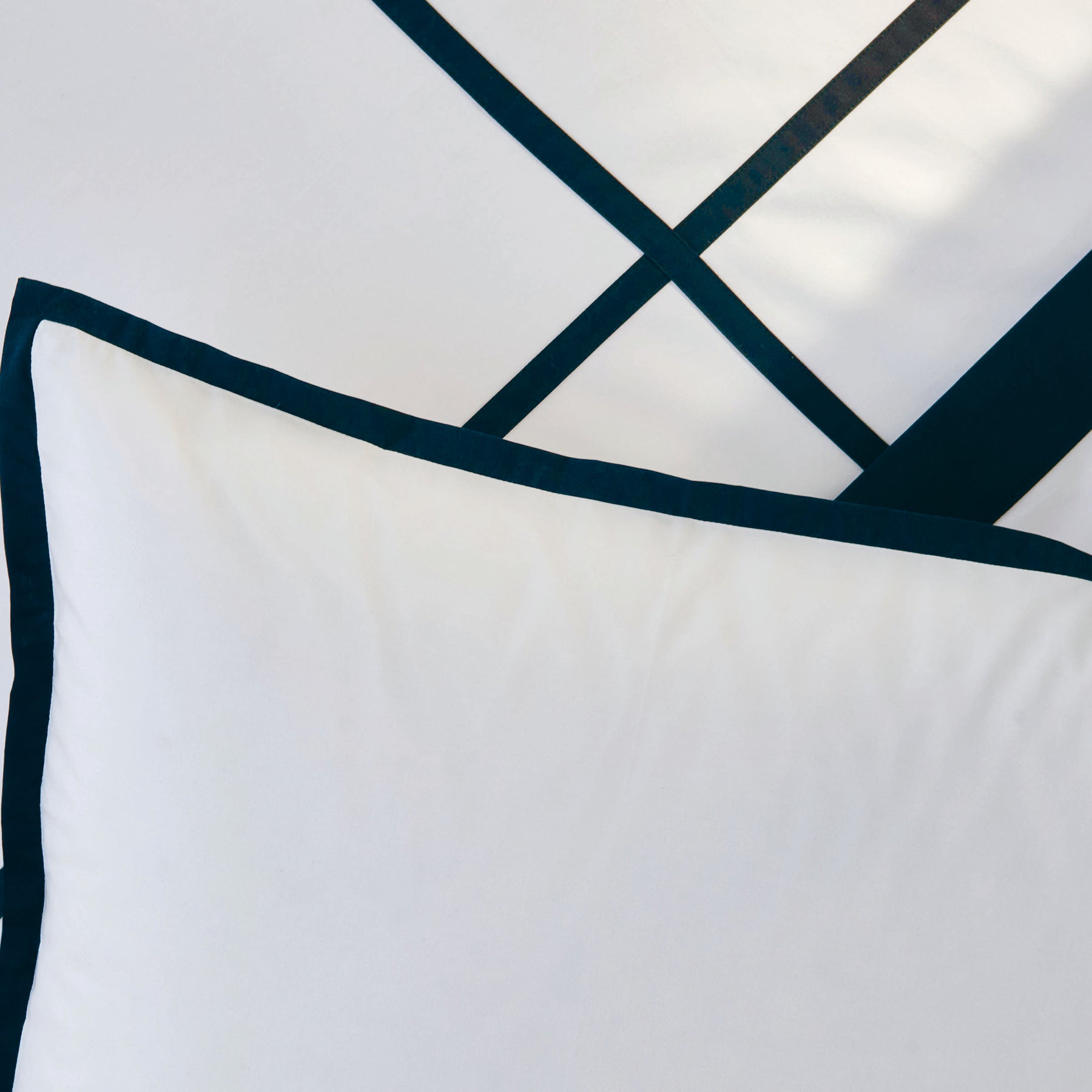 Minimalist and modern, the Fontainebleau bedding design embodies refined and timeless elegance. Crisp white percale bedding is expertly embellished with appliquéd banding. The banding is in navy blue. The dark blue colour of the trim, against the pure white, is very eye-catching and modern. Fontainebleau duvet covers have a very high style layout of the appliquéd banded lines on the front side. Appliqué means that the navy blue colored bands are expertly sewn atop the white fabric. Percale construction, 200 TC, made of 100% long-staple combed cotton. Made in Portugal.