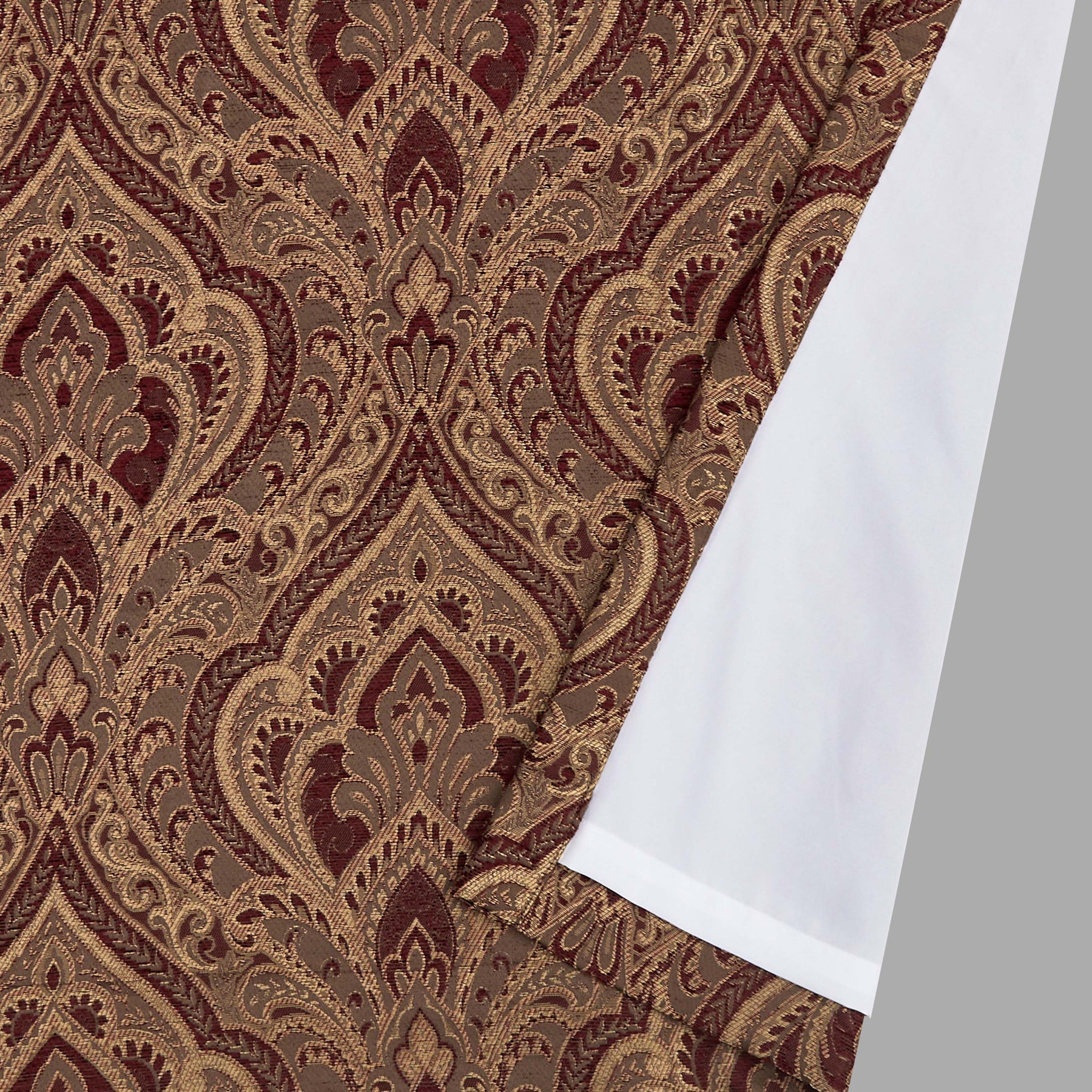 The odette window panels are intricately woven with a stunning damask design in tones of gold, chocolate and crimson red. The panels are lined for room darkening comfort and include coordinating tiebacks. Add the odette valance and bedding for a complete elegant look.