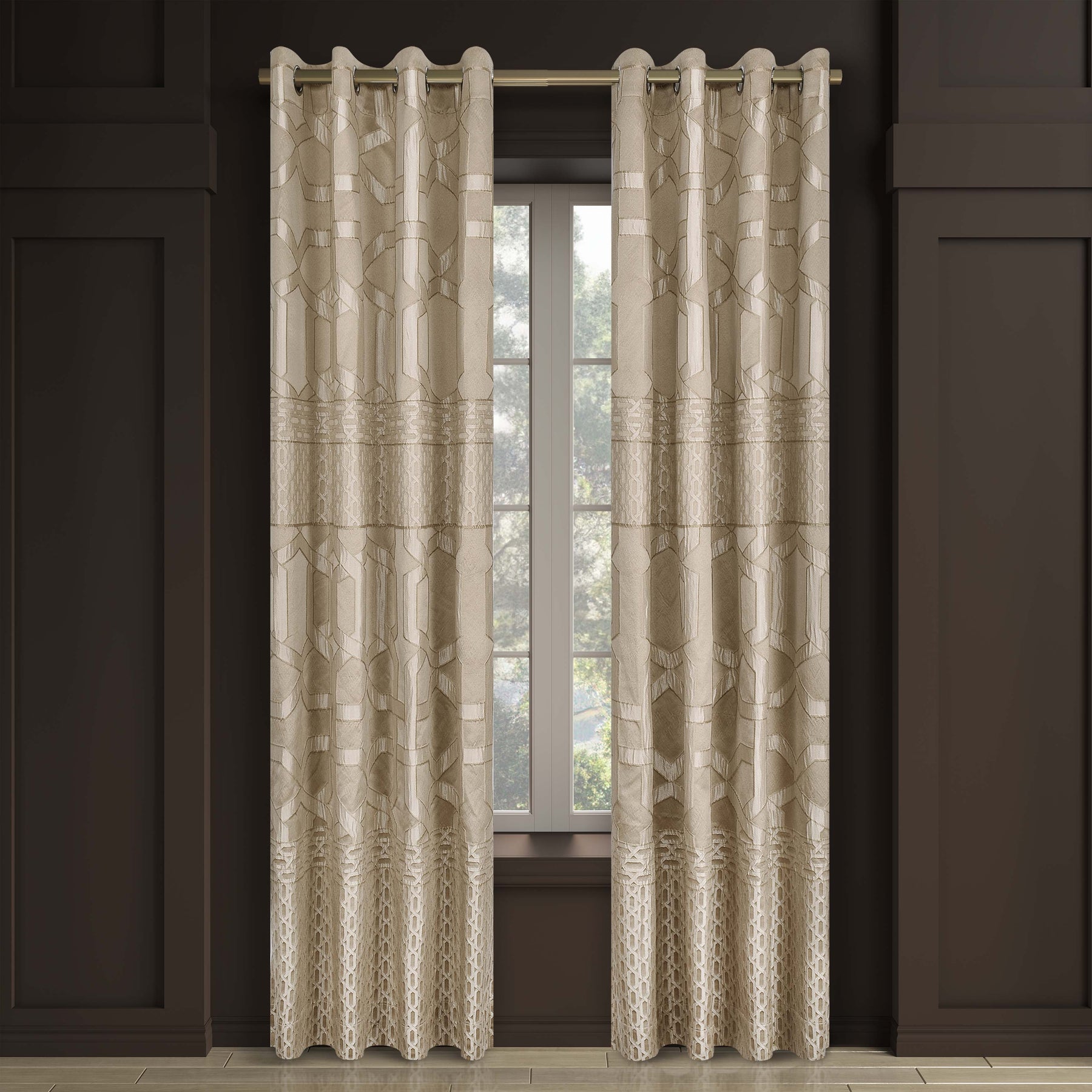 The olympus window panels feature intricate interlocking geometric patterns in neutral sand colors. Fully lined to provide darkness for comfortable sleep and the brushed nickel grommet top allows for easy setup. The panels can be paired with the olympus bedding collection to complete the contemporary look.