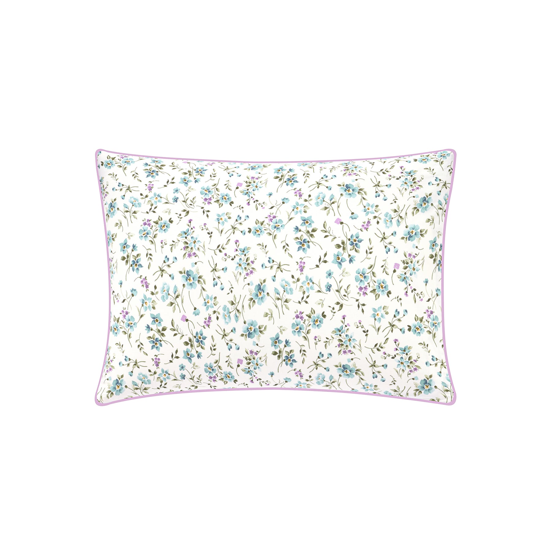 Fugace is a celebration of the senses. Flowers subtly invite themselves into this space of pure lines, forming a harmonious bridge between nature and architecture. Their delicate motifs infuse a touch of humanity and poetry, becoming a discreet accent, a delicate and perfectly mastered note. They awaken our senses, inviting contemplation and an intimate connection with the living. In Art, periwinkle flowers are said to impart a sense of calmness, spirituality, and peace, and are a symbol of love, hope, and strength. Fugace is the French word for fleeting, as in the periwinkle flowers which bloom for only a short period of time. The flowers print and the horizontal stripes print are done on a warm white ground. Fugace shams are embellished with a lilac colored piping finishing detail. Percale construction, 200 TC, made of 100% long-staple combed Organic cotton. Made in France.