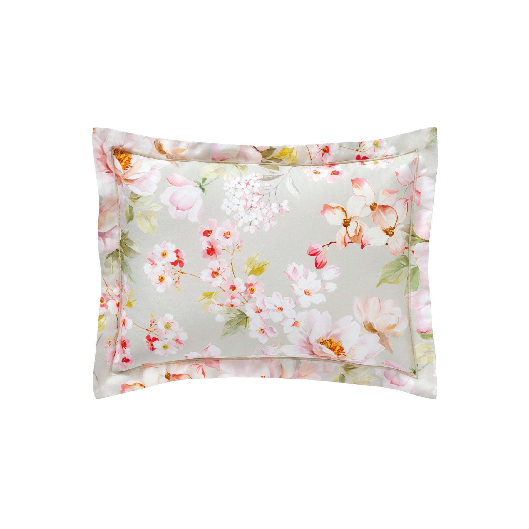 An invitation to travel where the refinement of the 1930s seduces with its poetry and softness. Refined shades that look like they escaped from delicate engravings filled with tender flowers and poetic brids. Subtle gradations of pink, from the most diaphanous to the most intense, with notes of mauve and coral. Voyageuse shams are reversible. One side has the luxurious floral print, the other the especially luxe Palmette print.