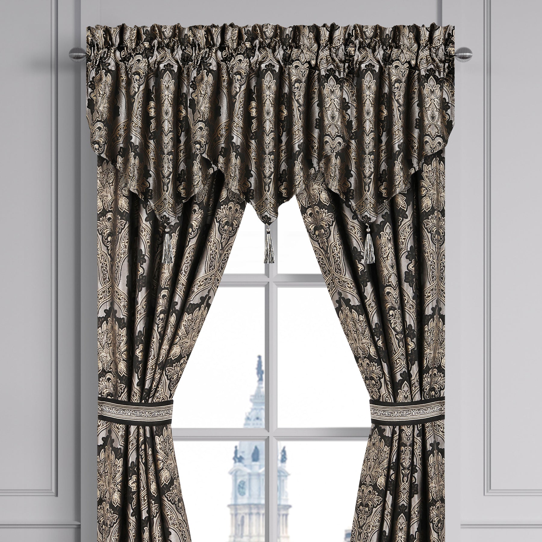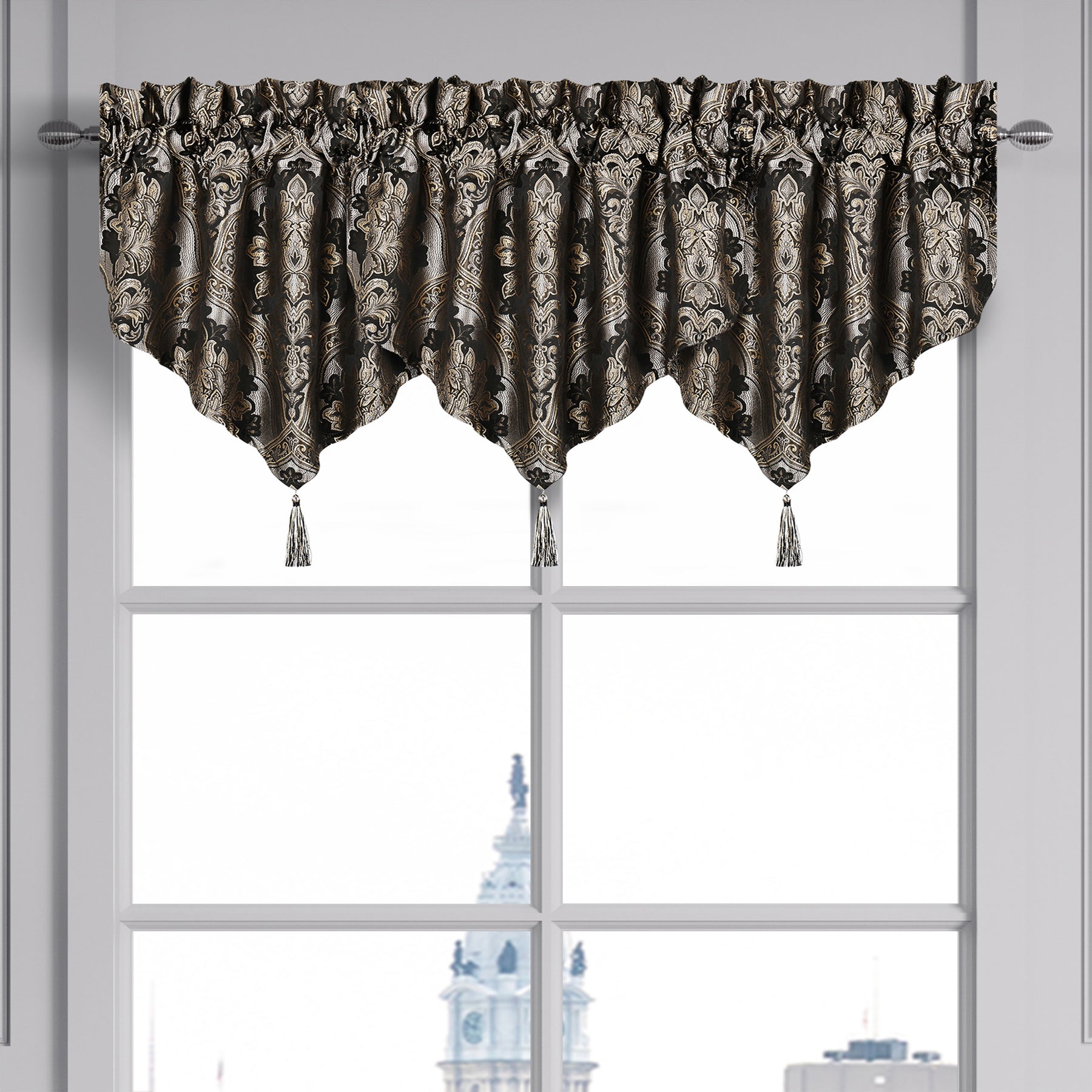 The Harriman ascot valance is exquisite with its ornate damask design in black and gold tones. This beautiful woven damask valance is rich with its plush weave and satin finish. Embellished with a mingled tassel trim, to add the finishing touch to this grand design. The 3" header and 3" rod pocket make this valance easy to hang. Window shown with three valances (each valance sold separately).