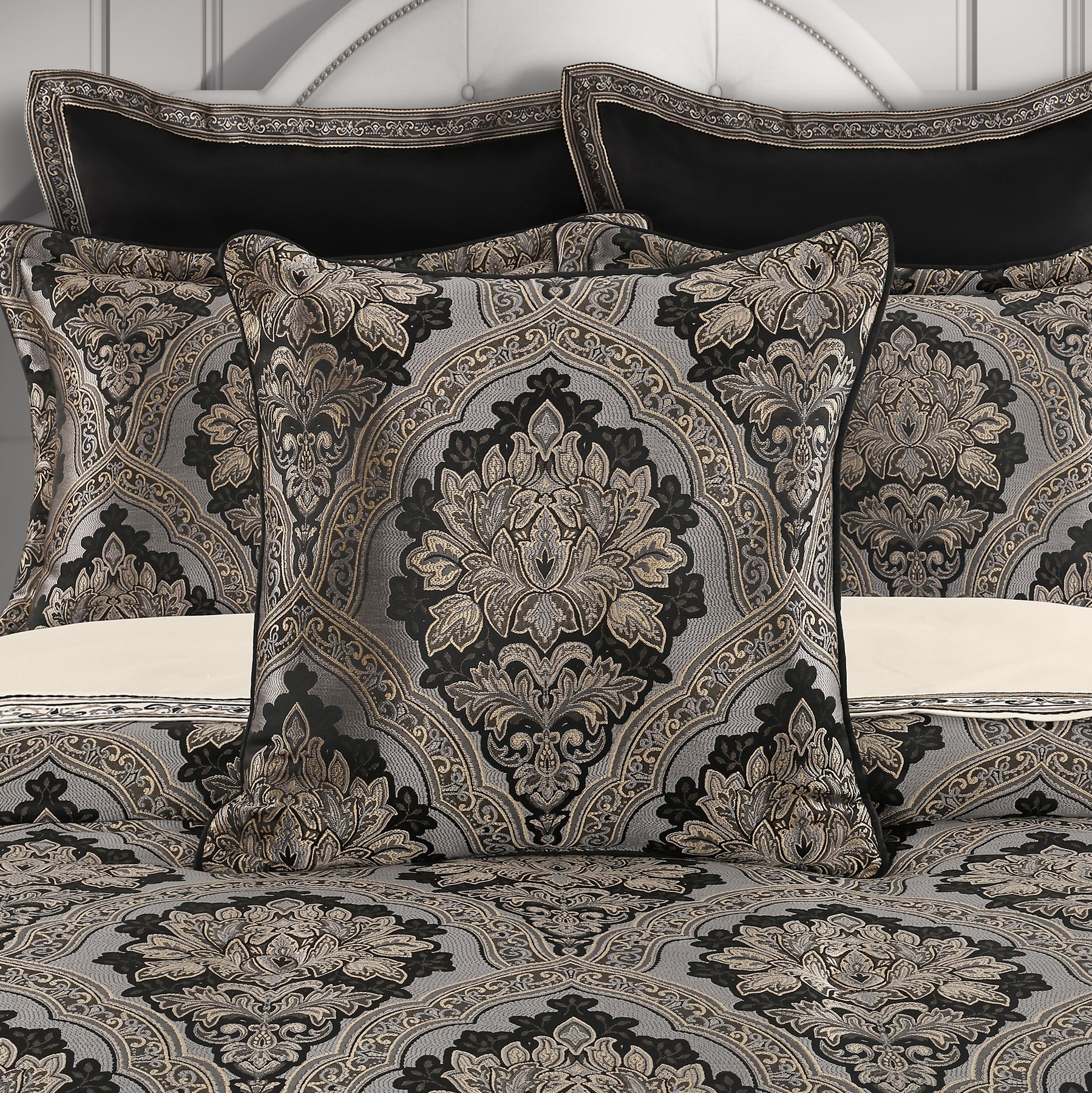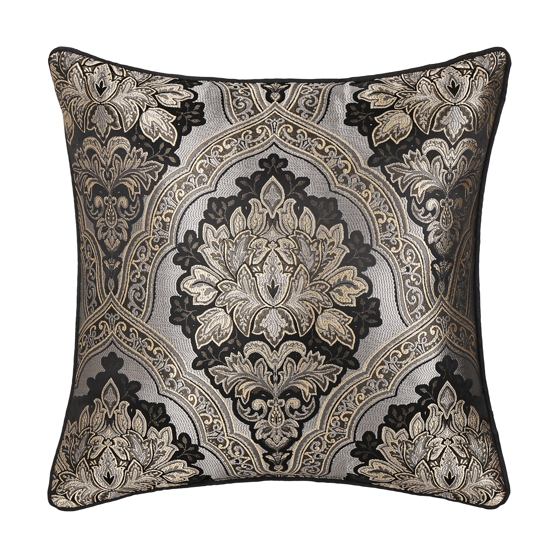 The Harriman 20" decorative throw pillow is truly exquisite with its dramatic use of black and golden hues. Featuring an ornate woven damask perfectly centered and it reverses to a black and gold woven stripe design. Pair this throw pillow with the Harriman bedding set and window treatments for a complete timeless traditional look.