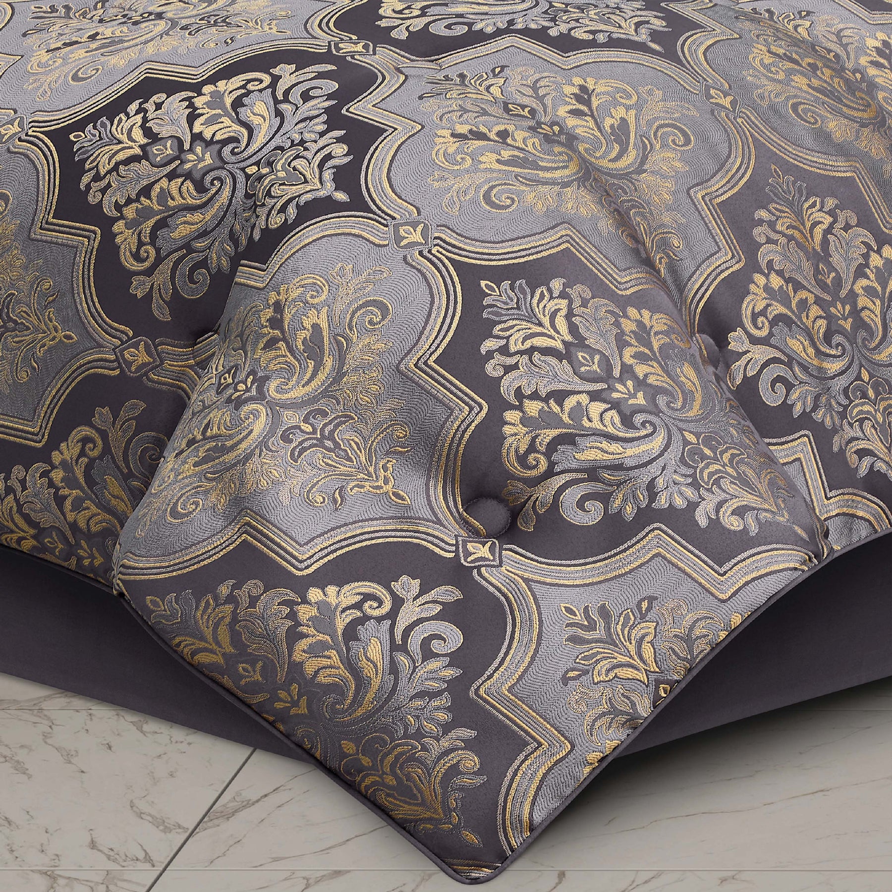 Timeless elegance is executed within every detail of the manchester 4 piece comforter set. An elegant soft lavender base fabric, is paired with a classic damask pattern in various shades of gold, which incorporate a stunning weave technique. A small satin piping finishes the lofty and oversized comforter that reverses to a plush solid fabric. Two padded pillow shams featuring a coordinate damask pattern and a split-corner bedskirt, beautifully complete the set. Pair this bedding collection with the manchester throw pillows, euros, and window treatments to add luxury and opulence to your bedroom.