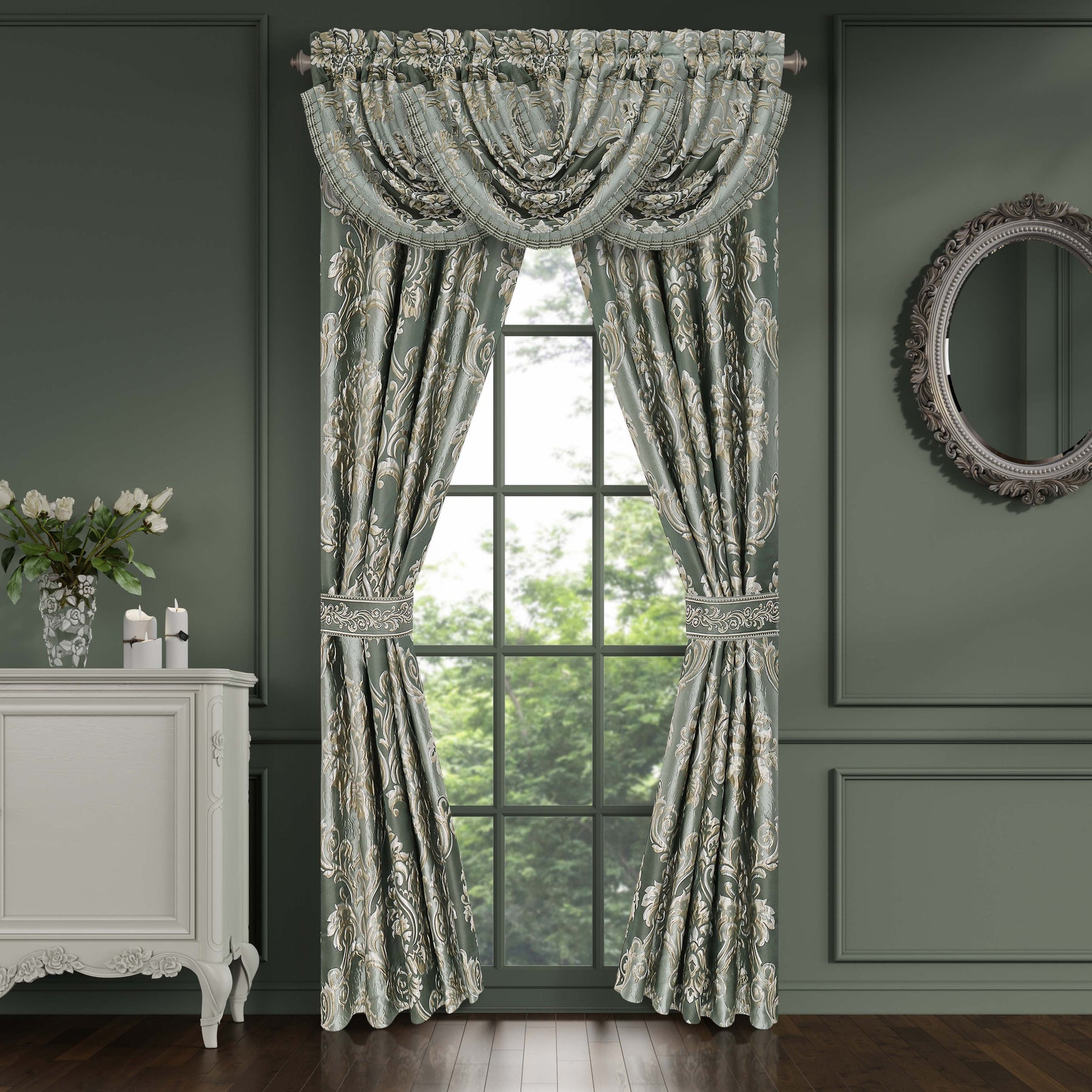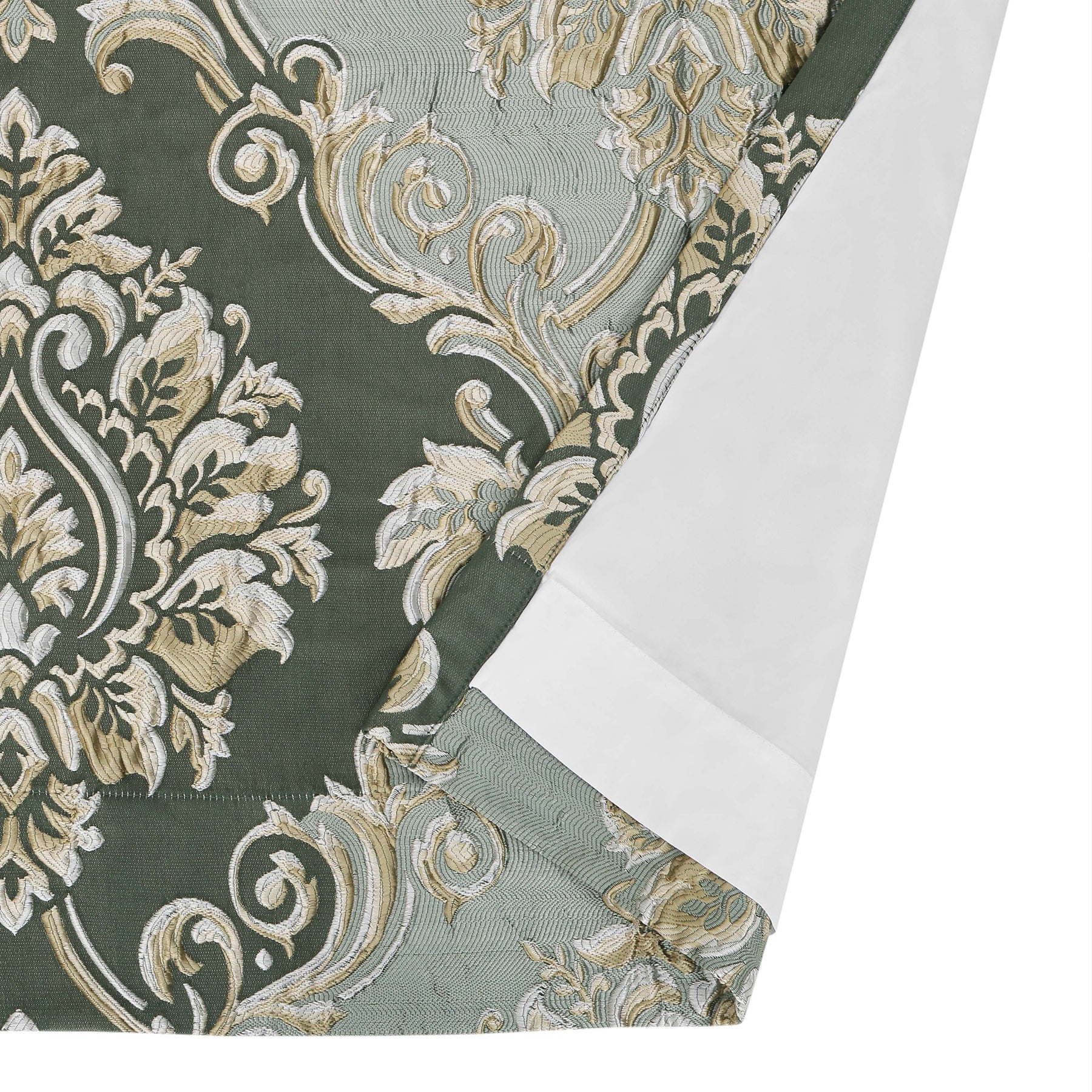 The alina window panel pair features a detailed traditional woven damask design in stunning tones of dusty teal, beige and soft silver. Each panel is lined to keep your room shaded and comfortable and the weighted hems allow the panels to drape beautifully. The luxurious panels include matching tiebacks to complete the fresh open airy look. Pair these panels with the alina window valance and bedding collection to complete your bedroom decor.