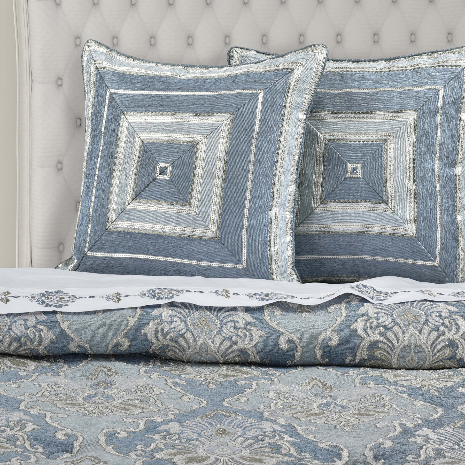 The celtic euro sham features a framed chenille mitered stripe. The sham reverses to a coordinating solid velvet with a hidden zipper closure and is finished with velvet piping. Pair this stunning backdrop to the celtic bedding set for a complete look (each sham sold separately).