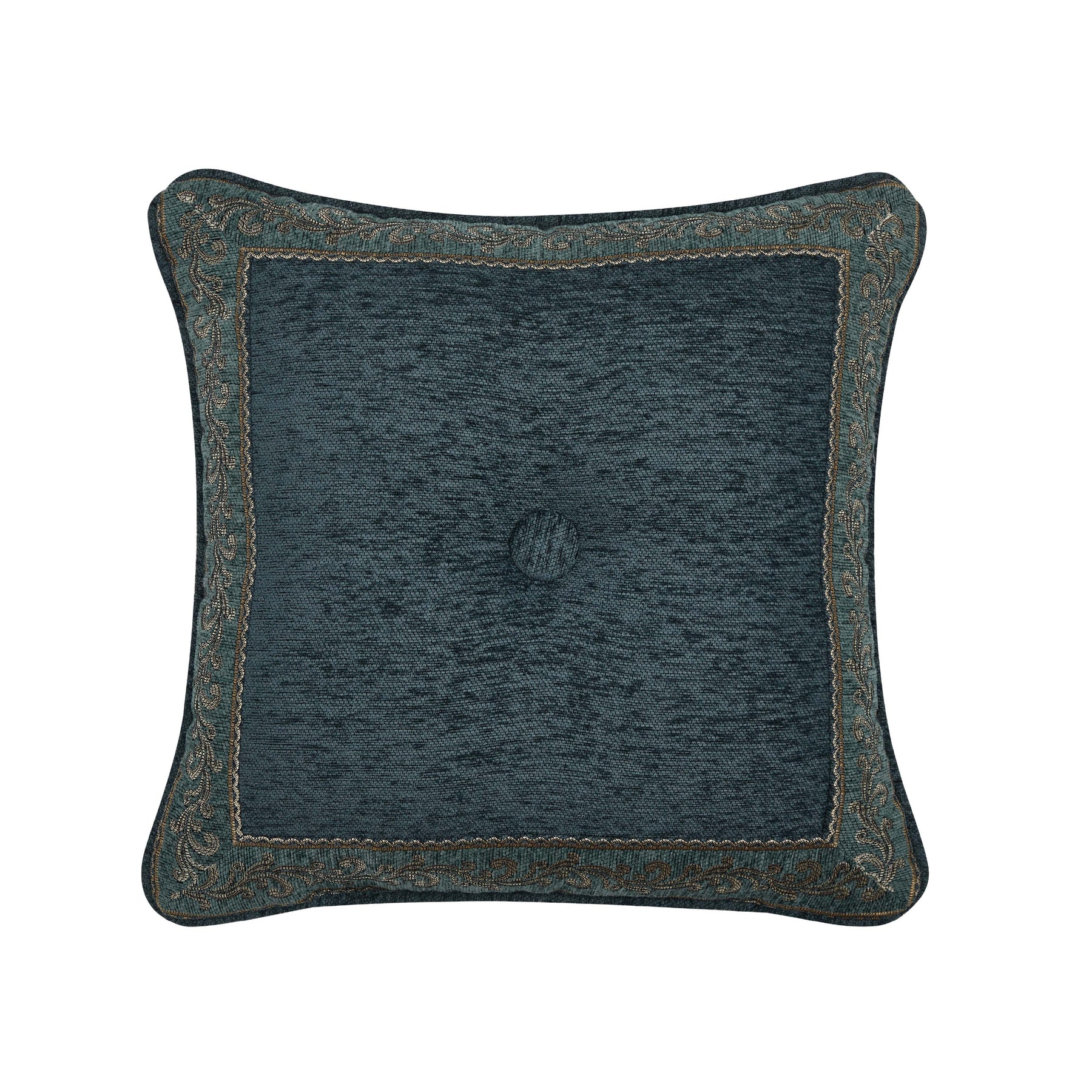 The nancy 18 inch throw pillow features a woven chenille scroll stripe design with a deeply tufted button accent and reverses to a dyed-to-match solid chenille fabric. This lovely accent pillow is finished with a self-fabric cord and was designed to coordinate with the nancy bedding collection.