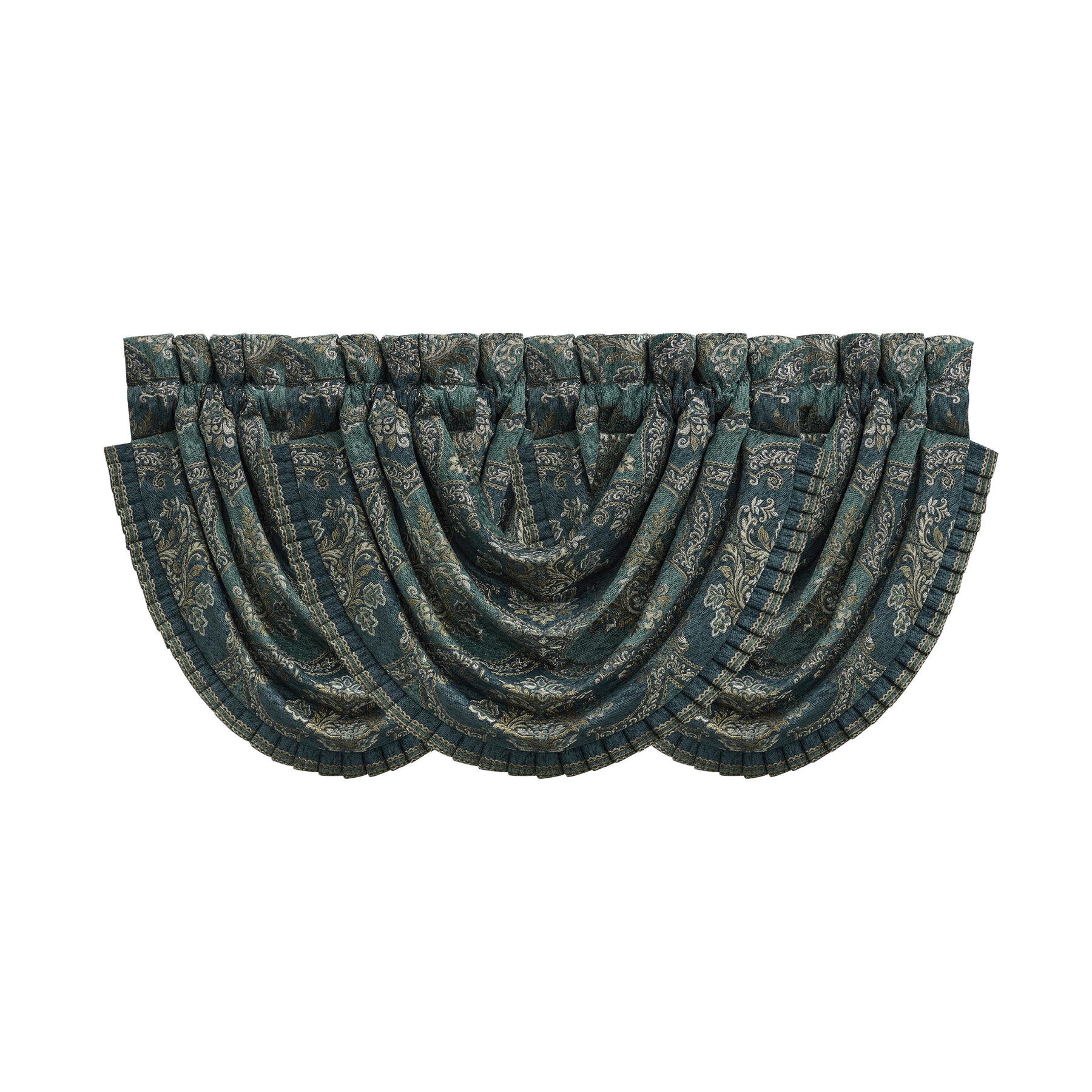 Create a custom look on your window with this elegant waterfall valance made with a dark teal and gold woven chenille damask fabric. Tailor-made and trimmed with a multi-color pleated fringe accent. In order to achieve the look in the photo, we suggest using three valances.