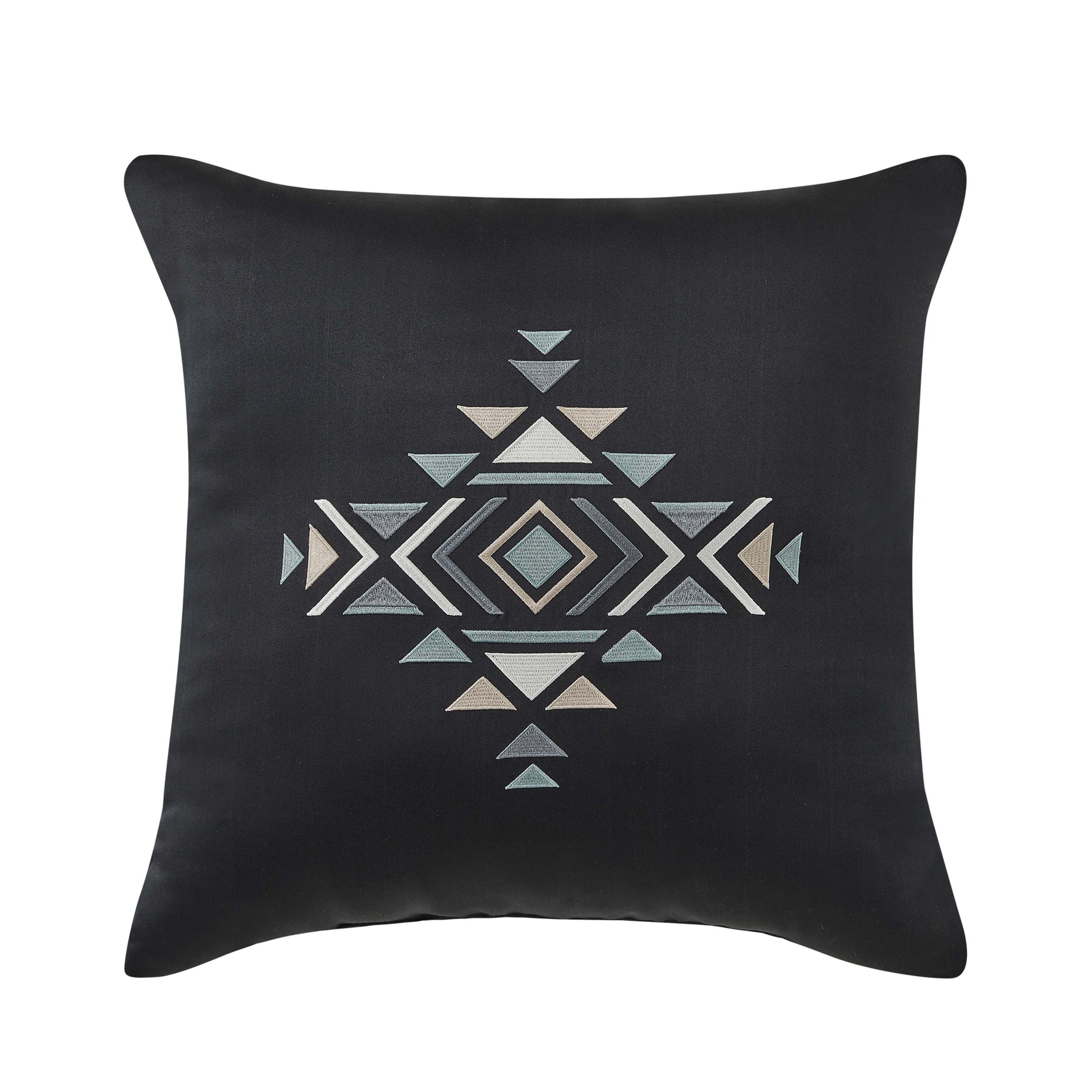 The parallel 18 inch pillow features an embroidered southwest aztec pattern in slate, blue, silver and grey on a black ground. The embellished accent pillow is finished with a self-fabric cord and adds a unique rustic charm to your decor. Pair this pillow with the parallel bedding and window treatments to complete the ensemble.