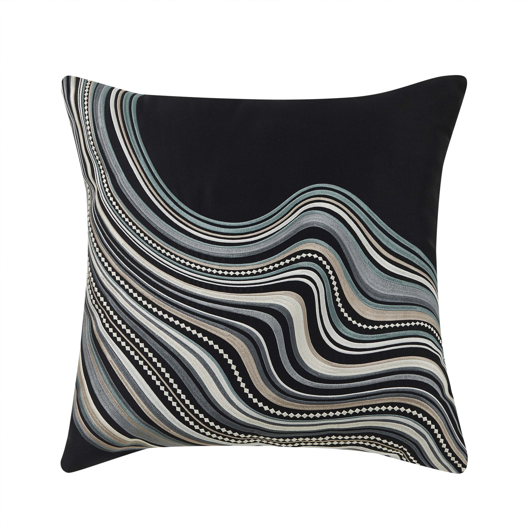The parallel 18 inch pillow features a abstract wave embroidered pattern in palette of slate, blue, silver and grey on a black ground. The embellished accent pillow is finished with a self-fabric cord and adds a unique charm to your decor. Pair this pillow with the parallel bedding and window treatments to complete the ensemble.